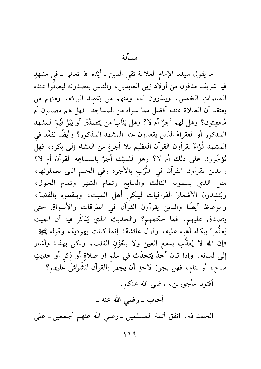 ما يقول سيدنا الإمام العلامة تقي الدين -أيَّده الله تعالى- في مشهدٍ فيه شريف مدفون من أولاد زين العابدين، والناس يقصدونه ليصلُّوا عنده الصلواتِ الخمسَ، وينذرون له، ومنهم من يَقصِد البركة، ومنهم من يعتقد أن الصلاة عنده أفضل مما سواه من المساجد. فهل هم مصيبون أم مخطِئون؟ وهل لهم أجر أم لا؟ وهل يُثابُ من يَتصدَّق أو يَبَرُّ قَيِّمَ المشهد المذكور أو الفقراءَ الذين يقعدون عند المشهد المذكور؟ وأيضًا يَقعُد في المشهد قُرَّاء يقرأون القرآن العظيم بلا أجرةٍ من العشاء إلى بكرة، فهل يُؤجَرون على ذلك أم لا؟ وهل للميِّت أجر باستماعِه القرآن أم لا؟ والذين يقرأون القرآن في التُّرَبِ بالأجرة وفي الختم التي يعملونها، مثل الذي يسمونه الثالث والسابع وتمام الشهر وتمام الحول، ويُنشِدون الأشعارَ الفراقيات ليبكي أهل الميت، وينقطوه بالفضة، والوعاظ أيضًا والذين يقرأون القرآن في الطرقات والأسواق حتى يتصدق عليهم، فما حكمهم؟ والحديث الذي يُذكَر فيه أن الميت يُعذَّبُ ببكاء أهلِه عليه، وقول عائشة: إنما كانت يهودية، وقوله - صَلَّى اللَّهُ عَلَيْهِ وَسَلَّمَ -: "إن الله لا يُعذِّب بدمع العين ولا بحُزْنِ القلب، ولكن بهذا" وأشار إلى لسانه. وإذا كان أحدٌ يَتحدَّث في عليم أو صلاةٍ أو ذِكرٍ أو حديثٍ مباح، أو ينام، فهل يجوز لأحدٍ أن يجهر بالقرآن ليُشَوِّش عليهم؟