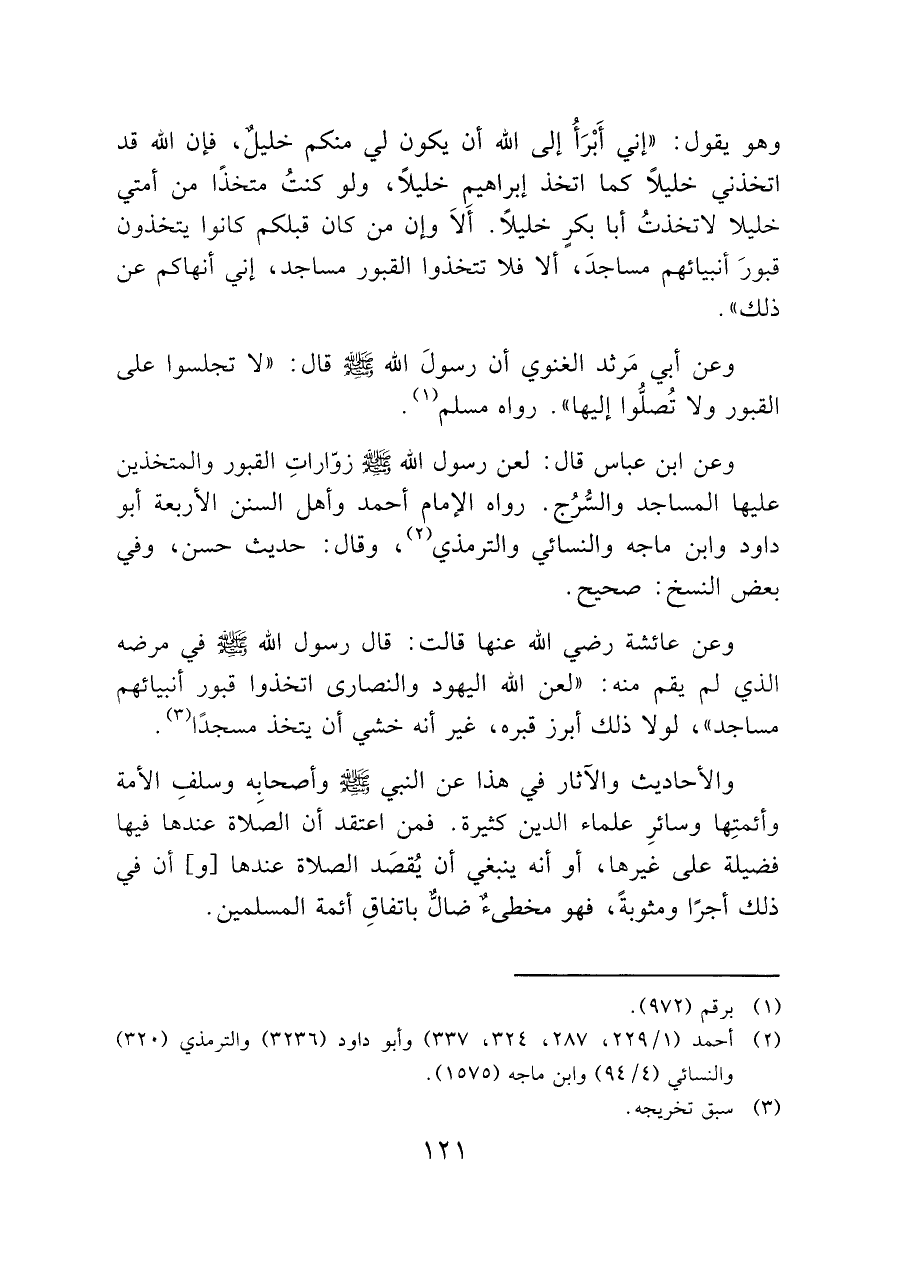 وعن ابن عباس قال: لعن رسول الله - صَلَّى اللَّهُ عَلَيْهِ وَسَلَّمَ - زوَّاراتِ القبور والمتخذين عليها المساجد والسُّرُج. رواه الإمام أحمد وأهل السنن الأربعة أبو داود وابن ماجه والنسائي والترمذي (¬٢)، وقال: حديث حسن، وفي بعض النسخ: صحيح.