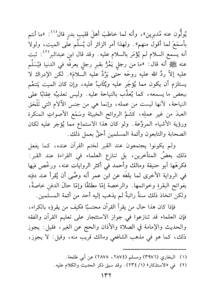 يُولُّون عنه مُدبرِين"، وأنه لما خاطبَ أهلَ قليب بدرٍ قال (¬١): "ما أنتم بأسمَعَ لما أقول منهم". ولهذا أمر الزائر أن يُسَلِّم على الميت، ولولا أنه يسمع السلام لم يُؤمَر بالسلام عليه. وقد قال ابن عبد البر (¬٢): ثبت عنه - صَلَّى اللَّهُ عَلَيْهِ وَسَلَّمَ - أنه قال: "ما من رجلٍ يَمُرُّ بقبرِ رجلٍ يعرفُه في الدنيا فيُسَلِّم عليه إلا ردَّ الله عليه روحَه حتى يَرُدَّ عليه السلامَ". لكن الإدراك لا يستلزم أن يكون مما يُؤجَر عليه ويُثَابُ عليه، وإن كان الميت يَتنعَّم ببعض ما يسمعه، كما يُعذَّب بالنياحة عليه. وليس تعذيبُه عِقابًا على النياحة، لأنها ليست من عمله، وإنما هي من جنس الآلام التي تَلْحَق العبدَ من غير عملِه، كشَمِّ الروائح الخبيثة وسَمْع الأصواتِ المنكرة ورؤية الأشياء المروِّعة. ولو كان هذا الاستماع مما يُؤجر عليه لكان الصحابة والتابعون وأئمة المسلمين أحقَّ بعمل ذلك.