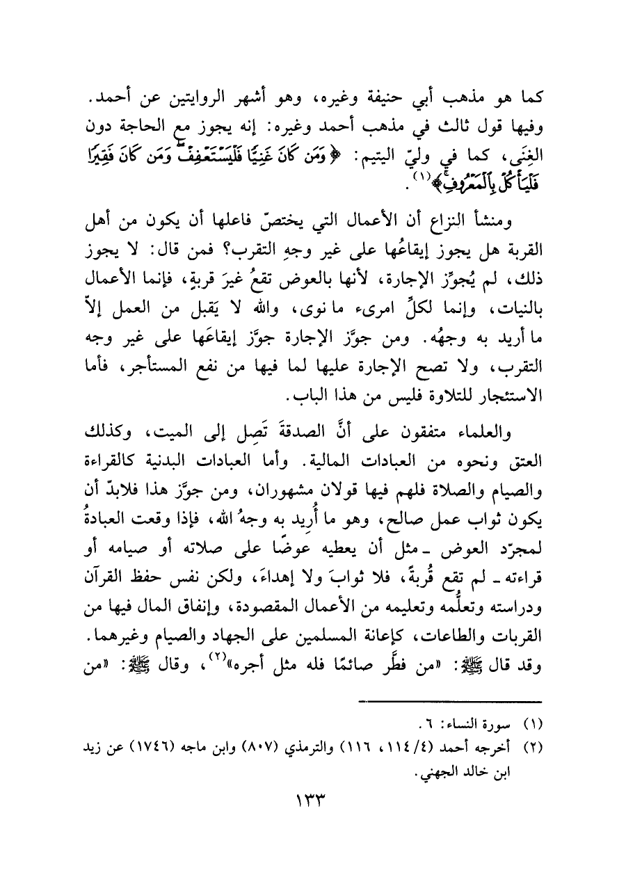 ومنشأ النزاع أن الأعمال التي يختصّ فاعلها أن يكون من أهل القربة هل يجوز إيقاعُها على غير وجهِ التقرب؟ فمن قال: لا يجوز ذلك، لم يُجوِّز الإجارة، لأنها بالعوض تقعُ غيرَ قربةٍ، فإنما الأعمال بالنيات، وإنما لكل امرئ ما نوى، والله لا يَقبل من العمل إلا ما أريد به وجهُه. ومن جوَّز الإجارة جوَّز إيقاعَها على غير وجه التقرب، ولا تصح الإجارة عليها لما فيها من نفع المستأجر، فأما الاستئجار للتلاوة فليس من هذا الباب.