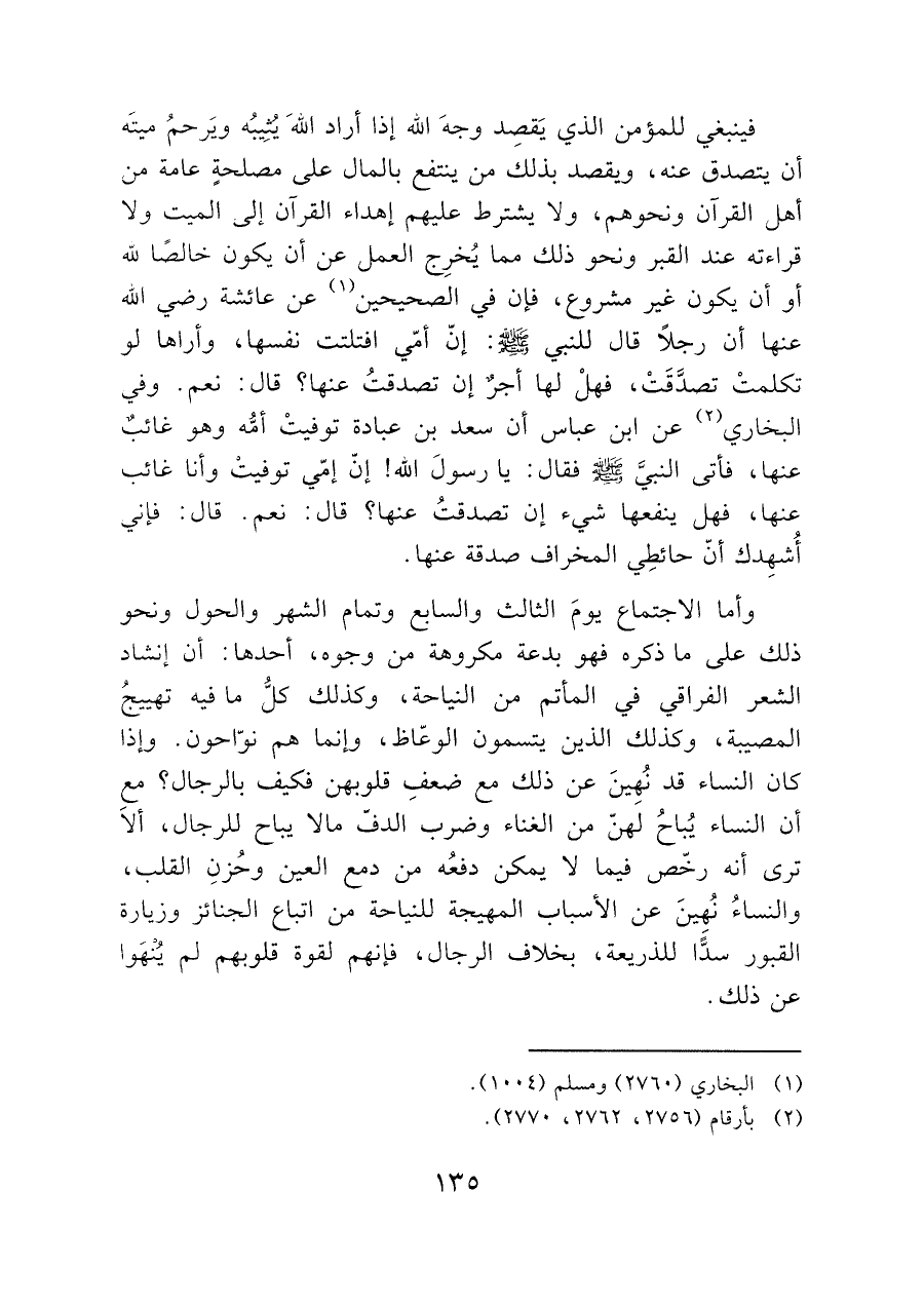 فينبغي للمؤمن الذي يَقصِد وجهَ الله إذا أراد اللهَ يُثيبُه ويَرحمُ ميتَه أن يتصدق عنه، ويقصد بذلك من ينتفع بالمال على مصلحةٍ عامة من أهل القرآن ونحوهم، ولا يشترط عليهم إهداء القرآن إلى الميت ولا قراءته عند القبر ونحو ذلك مما يُخرِج العمل عن أن يكون خالصًا لله أو أن يكون غير مشروع، فإن في الصحيحين (¬١) عن عائشة رضي الله عنها أن رجلًا قال للنبي - صَلَّى اللَّهُ عَلَيْهِ وَسَلَّمَ -: إنّ أمّي افتلتت نفسها، وأراها لو تكلمتْ تصدَّقَتْ، فهلْ لها أجرٌ إن تصدقتُ عنها؟ قال: نعم. وفي البخاري (¬٢) عن ابن عباس أن سعد بن عبادة توفيتْ أمُّه وهو غائبٌ عنها، فأتى النبي - صَلَّى اللَّهُ عَلَيْهِ وَسَلَّمَ - فقال: يا رسولَ الله! إن أمّي توفيت وأنا غائب عنها، فهل ينفعها شيء إن تصدقتُ عنها؟ قال: نعم. قال: فإني أُشهِدك أنّ حائطِي المخراف صدقة عنها.
