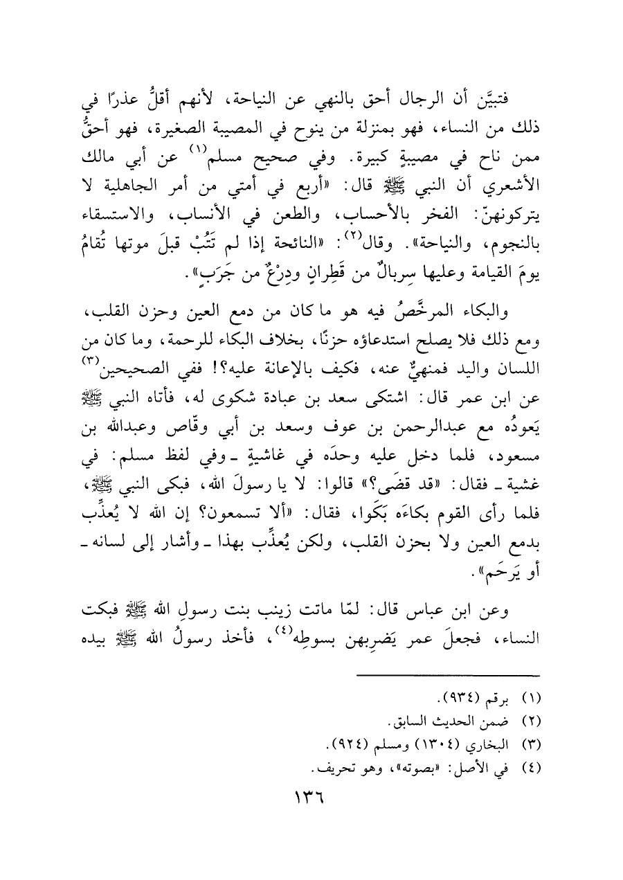 فتبيَّن أن الرجال أحق بالنهي عن النياحة، لأنهم أقلُّ عذرًا في ذلك من النساء، فهو بمنزلة من ينوح في المصيبة الصغيرة، فهو أحقُّ ممن ناح في مصيبةٍ كبيرة. وفي صحيح مسلم (¬١) عن أبي مالك الأشعري أن النبي - صَلَّى اللَّهُ عَلَيْهِ وَسَلَّمَ - قال: "أربع في أمتي من أمر الجاهلية لا يتركونهنّ: الفخر بالأحساب، والطعن في الأنساب، والاستسقاء بالنجوم، والنياحة". وقال (¬٢): "النائحة إذا لمِ تَتُبْ قبلَ موتها تُقامُ يومَ القيامة وعليها سِربالٌ من قَطِرانٍ ودِرع من جرَبٍ".