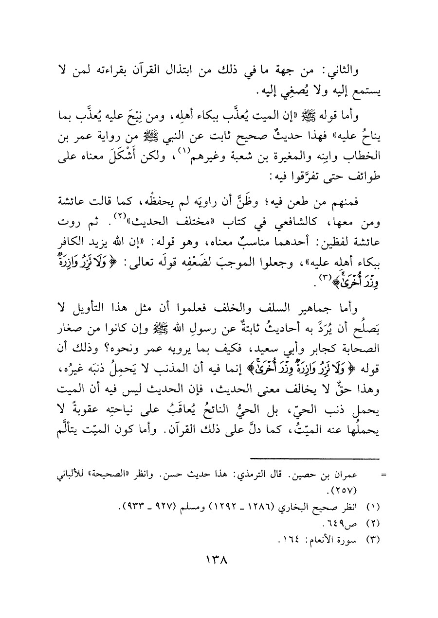 وأما جماهير السلف والخلف فعلموا أن مثل هذا التأويل لا يَصلُح أن يُرَدَّ به أحاديثُ ثابتةٌ عن رسولِ الله - صَلَّى اللَّهُ عَلَيْهِ وَسَلَّمَ - وإن كانوا من صغار الصحابة كجابر وأبي سعيد، فكيف بما يرويه عمر ونحوه؟ وذلك أن قوله (وَلا تَزِرُ وَازِرَةٌ وِزْرَ أُخْرَى) إنما فيه أن المذنب لا يَحمِلُ ذنبَه غيرُه، وهذا حق لا يخالف معنى الحديث، فإن الحديث ليس فيه أن الميت يحمل ذنب الحيّ، بل الحيُّ النائحُ يُعاقَبُ على نياحتِه عقوبةً لا يحملُها عنه الميّتُ، كما دلَّ على ذلك القرآن. وأما كون الميّت يتألَّم