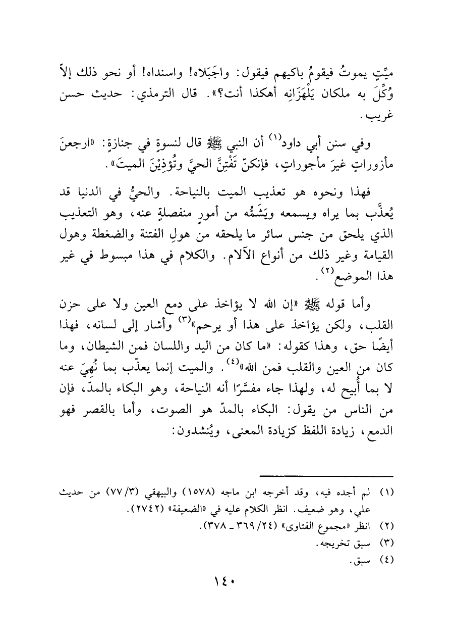 وأما قوله - صَلَّى اللَّهُ عَلَيْهِ وَسَلَّمَ - "إن الله لا يؤاخذ على دمع العين ولا على حزن القلب، ولكن يؤاخذ على هذا أو يرحم" (¬٣) وأشار إلى لسانه، فهذا أيضًا حق، وهذا كقوله: "ما كان من اليد واللسان فمن الشيطان، وما كان من العين والقلب فمن الله" (¬٤). والميت إنما يعذّب بما نُهِيَ عنه لا بما أبيح له، ولهذا جاء مفسَّرًا أنه النياحة، وهو البكاء بالمدّ، فإن من الناس من يقول: البكاء بالمدّ هو الصوت، وأما بالقصر فهو الدمع، زيادة اللفظ كزيادة المعنى، ويُنشدون: