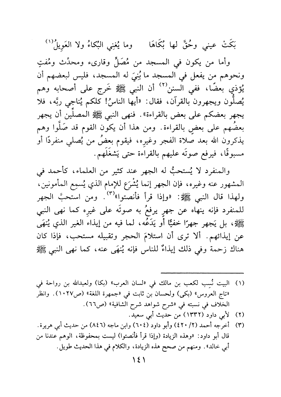 وأما من يكون في المسجد من مُصَلٍّ وقارئ ومحدِّث ومُفتٍ ونحوهم من يفعل في المسجد ما بُنِيَ له المسجد، فليس لبعضهم أن يُؤذي بعضًا، ففي السنن (¬٢) أن النبي - صَلَّى اللَّهُ عَلَيْهِ وَسَلَّمَ - خَرج على أصحابه وهم يُصلُّون ويجهرون بالقرآن، فقال: "أيها الناسُ! كلكم يُناجي ربه، فلا يجهر بعضكم على بعض بالقراءة". فنهى النبي - صَلَّى اللَّهُ عَلَيْهِ وَسَلَّمَ - المصلِّين أن يجهر بعضُهم على بعضٍ بالقراءة. ومن هذا أن يكون القوم قد صَلَّوا وهم يذكرون الله بعد صلاة الفجر وغيرِه، فيقوم بعضُ من يُصلي منفردًا أو مسبوقًا، فيرفع صوتَه عليهم بالقراءة حتى يَشغَلَهم.