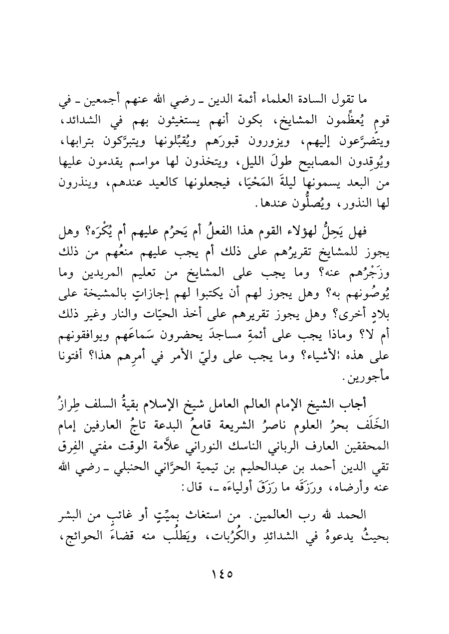 أجاب الشيخ الإمام العالم العامل شيخ الإسلام بقيةُ السلف طِرازُ الخَلَف بحرُ العلوم ناصرُ الشريعة قامعُ البدعة تاجُ العارفين إمام المحققين العارف الرباني الناسك النوراني علَاّمة الوقت مفتي الفِرق تقي الدين أحمد بن عبد الحليم بن تيمية الحرَّاني الحنبلي -رضي الله عنه وأرضاه، ورَزَقَه ما رَزَقَ أولياءَه-، قال: