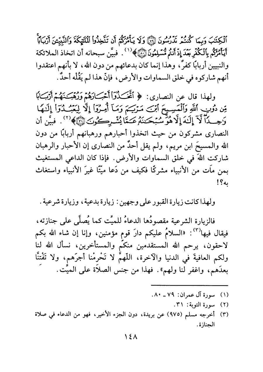 ولهذا قال عن النصارى: (اتَّخَذُوا أَحْبَارَهُمْ وَرُهْبَانَهُمْ أَرْبَابًا مِنْ دُونِ اللَّهِ وَالْمَسِيحَ ابْنَ مَرْيَمَ وَمَا أُمِرُوا إِلَّا لِيَعْبُدُوا إِلَهًا وَاحِدًا لا إِلَهَ إِلَّا هُوَ سُبْحَانَهُ عَمَّا يُشْرِكُونَ (٣١)) (¬٢). فبيَّن أن النصارى مشركون من حيث اتخذوا أحبارهم ورهبانهم أربابًا من دون الله والمسيحَ ابن مريم، ولم يقل أحد من النصارى أن الأحبار والرهبان شاركتِ الله في خلق السماوات والأرض. فإذا كان الداعي المستغيث بمن مات من الأنبياء مشركًا فكيف من دَعا ميّتًا غيرَ الأنبياء واستغاث به؟!