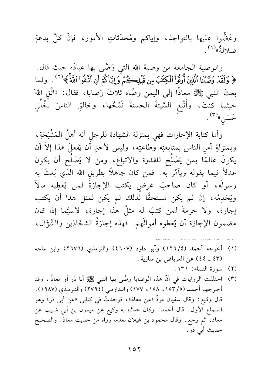 وأما كتابة الإجازات فهي بمنزلة الشهادة للرجلِ أنه أهلُ المَشْيَخةِ، وبمنزلةِ أمرِ الناس بمتابعتِه وطاعتِه، وليس لأحدٍ أن يَفعلَ هذا إلا أن يكونَ عالمًا بمن يَصْلُح للقدوة والاتباع، ومن لا يَصْلُح أن يكون عدلًا فيما يقوله ويأمُر به. فمن كان جاهلًا بطريقِ الله الذي بَعثَ به رسولَه، أو كان صاحبَ غرضٍ يكتب الإجازةَ لمن يُعطِيه مالًا ويَخدِمُه، إن لم يكن مستحقًّا لذلك لم يكن لمثل هذا أن يكتب إجازة، ولا حرمةَ لمن كتبَ له مثلُ هذا إجازة، لاسيَّما إذا كان مضمون الإجازة أن يُعطوه أموالَهم. فهذه إجازةُ الشحَّاذين والسُّوَّال،