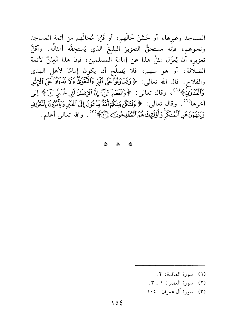المساجد وغيرِها، أو حَسَّنَ حَالَهم، أو قَرَّرَ مُحالَهم من أئمة المساجد ونحوهم، فإنه مستحقٌّ التعزيرَ البليغَ الذي يَستحِقُّه أمثالُه. وأقلُّ تعزيرِه أن يُعزَل مثلُ هذا عن إمامة المسلمين، فإن هذا مُعِيْنٌ لأئمة الضلالة، أو هو منهم، فلا يَصلُح أن يكون إمامًا لأهلِ الهدى والفلاح. قال الله تعالى: (وَتَعَاوَنُواْ عَلَى اَلِبرِّ وَاَلتَّقْوَى وَلا تَعَاوَنوُاْ عَلَى الإثمِ وَالعُدوَانِ) (¬١)، وقال تعالى: (وَالْعَصْرِ (١) إِنَّ الإِنْسَانَ لَفِي خُسْرٍ (٢)) إلى آخرها (¬٢). وقال تعالى: (وَلْتَكُنْ مِنْكُمْ أُمَّةٌ يَدْعُونَ إِلَى الْخَيْرِ وَيَأْمُرُونَ بِالْمَعْرُوفِ وَيَنْهَوْنَ عَنِ الْمُنْكَرِ وَأُولَئِكَ هُمُ الْمُفْلِحُونَ (١٠٤)) (¬٣). والله تعالى أعلم.
