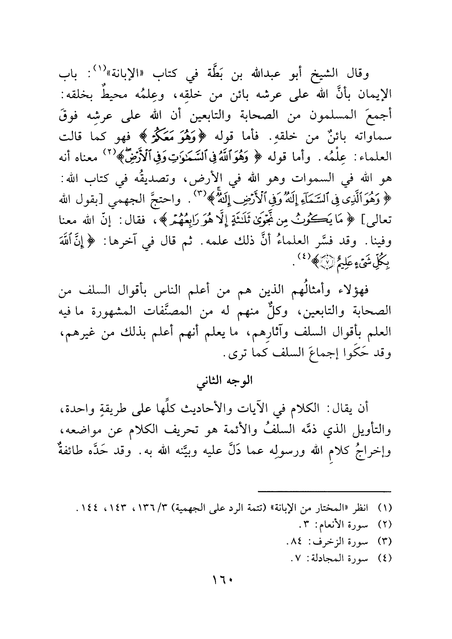 وقال الشيخ أبو عبد الله بن بَطَّة في كتاب "الإبانة" (¬١): باب الإيمان بأن الله على عرشه بائن من خلقِه، وعِلمُه محيط بخلقه: أجمعَ المسلمون من الصحابة والتابعين أن الله على عرشِه فوقَ سماواته بائنٌ من خلقهِ. فأما قوله (وَهُوَ مَعَكُمْ) فهو كما قالت العلماء: عِلْمُه. وأما قوله (وَهُوَ اللَّهُ فِي السَّمَاوَاتِ وَفِي الْأَرْضِ) (¬٢) معناه أنه هو الله في السماوات وهو الله في الأرض، وتصديقُه في كتاب الله: (وَهُوَ الَّذِي فِي اَلسَّمَاءِ إِلَهٌ وَفِى الأَرضِ إِلَهٌ) (¬٣). واحتجَّ الجهمي [بقول الله تعالى] (مَا يَكُونُ مِنْ نَجْوَى ثَلاثَةٍ إِلَّا هُوَ رَابِعُهُمْ)، فقال: إن الله معنا وفينا. وقد فسَّر العلماءُ أن ذلك علمه. ثم قال في آخرها (إِنَّ اللَّهَ بِكُلِّ شَيْءٍ عَلِيمٌ (٧)) (¬٤).