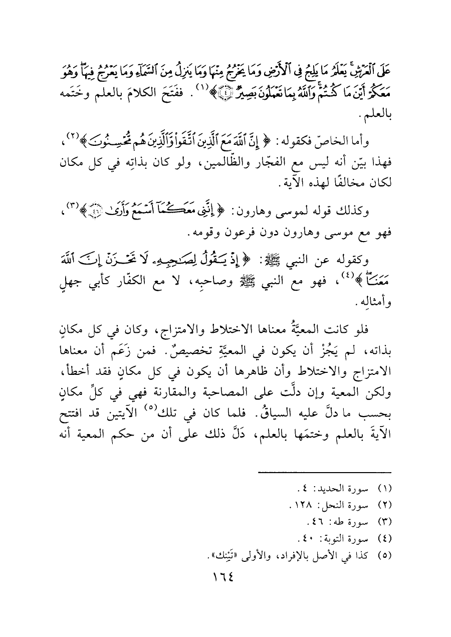فلو كانت المعيَّةُ معناها الاختلاط والامتزاج، وكان في كل مكانٍ بذاته، لم يَجُزْ أن يكون في المعيَّةِ تخصيصٌ. فمن زَعَم أن معناها الامتزاج والاختلاط وأن ظاهرها أن يكون في كل مكانٍ فقد أخطأ، ولكن المعية وإن دلَّت على المصاحبة والمقارنة فهي في كل مكانٍ بحسب ما دلَّ عليه السياقُ. فلما كان في تلك (¬٥) الآيتين قد افتتح الآية بالعلم وختمَها بالعلم، دَلَّ ذلك على أن من حكم المعية أنه