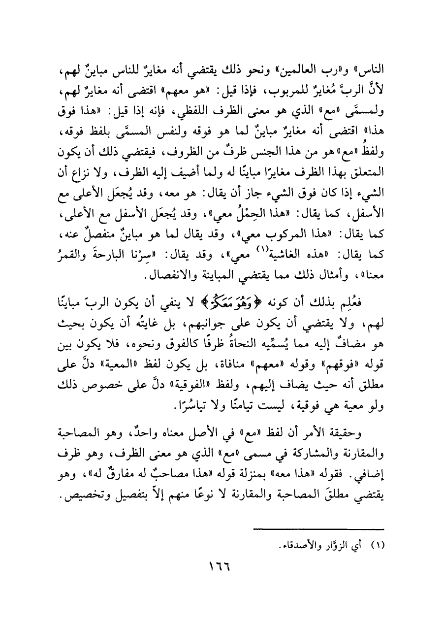وحقيقة الأمر أن لفظ "مع" في الأصل معناه واحدٌ، وهو المصاحبة والمقارنة والمشاركة في مسمى "مع" الذي هو معنى الظرف، وهو ظرف إضافي. فقوله "هذا معه" بمنزلة قوله "هذا مصاحبٌ له مفارقٌ له"، وهو يقتضي مطلقَ المصاحبة والمقارنة لا نوعًا منهم إلا بتفصيل وتخصيص.