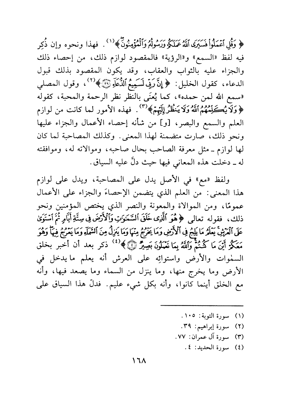 (وَقُلِ اعْمَلُواْ فَسَيَرَى اللهُ عملَكمْ ورَسُولُهُ وَالمُؤمِنُونَ) (¬١). فهذا ونحوه وإن ذُكِر فيه لفظ "السمع" و"الرؤية" فالمقصود لوازم ذلك، من إحصاء ذلك والجزاء عليه بالثواب والعقاب، وقد يكون المقصود بذلك قبول الدعاء، كقول الخليل: (إِنَ رَبِّى لَسَمِيعُ الدُّعَاءِ (٣٩)) (¬٢)، وقول المصلي "سمع الله لمن حمده"، كما يُعنَى بالنظر نظر الرحمة والمحبة، كقوله (وَلا يُكَلِّمُهُمُ اللَّهُ وَلا يَنْظُرُ إِلَيْهِمْ) (¬٣). فهذه الأمور لما كانت من لوازم العلم والسمع والبصر، [و] من شأنه إحصاء الأعمال والجزاء عليها ونحو ذلك، صارت متضمنة لهذا المعنى. وكذلك المصاحبة لما كان لها لوازم -مثل معرفة الصاحب بحال صاحبه، وموالاته له، وموافقته له- دخلت هذه المعاني فيها حيث دلَّ عليه السياق.