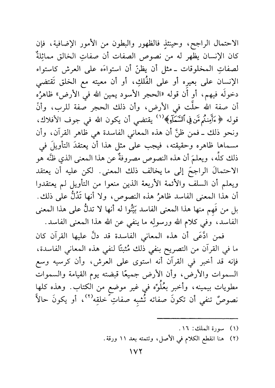 الاحتمال الراجح، وحينئذٍ فالظهور والبطون من الأمور الإضافية، فإن كان الإنسان يظهر له من نصوص الصفات أن صفاتِ الخالق مماثِلةٌ لصفاتِ المخلوقات -مثل أن يظنّ أن استواءَه على العرش كاستواء الإنسان على بعيرِه أو على الفُلكِ، أو أن معيته مع الخلق تَقتضي دخولَه فيهم، أو أن قوله "الحجر الأسود يمين الله في الأرض" ظاهرُه أن صفة الله حلَّت في الأرض، وأن ذلك الحجر صفة للرب، وأنّ قوله (أَأَمِنْتُمْ مَنْ فِي السَّمَاءِ) (¬١) يقتضي أن يكون الله في جوف الأفلاك، ونحو ذلك- فمن ظنَّ أن هذه المعاني الفاسدة هي ظاهر القرآن، وأن مسماها ظاهره وحقيقته، فيجب على مثل هذا أن يعتقدَ التأويل في ذلك كلِّه، ويعلمَ أن هذه النصوص مصروفةٌ عن هذا المعنى الذي ظنَّه هو الاحتمالَ الراجحَ إلى ما يخالف ذلك المعنى. لكن عليه أن يعتقد ويعلم أن السلف والأئمة الأربعة الذين منعوا من التأويل لم يعتقدوا أن هذا المعنى الفاسد ظاهرُ هذه النصوص، ولا أنها تَدُلُّ على ذلك.