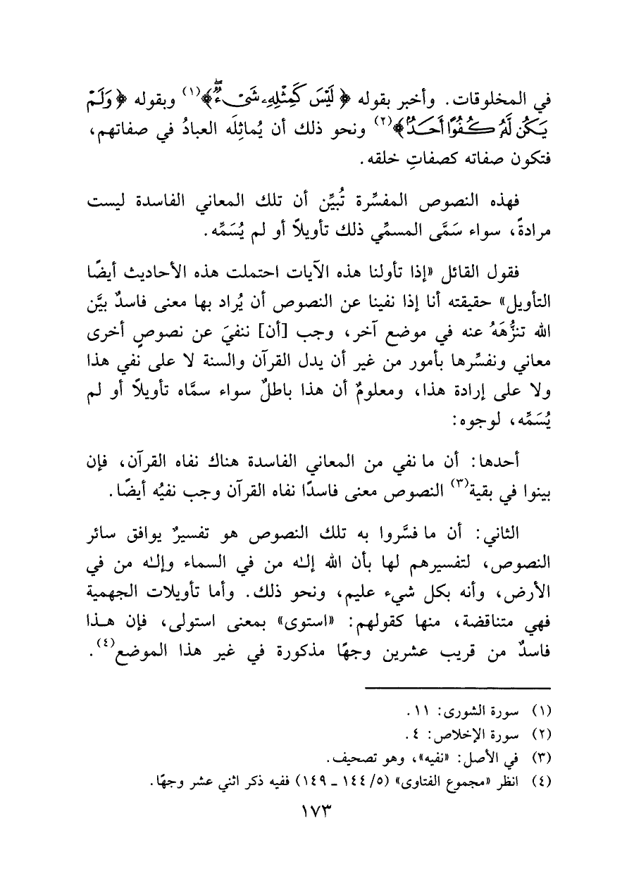 فقول القائل "إذا تأولنا هذه الآيات احتملت هذه الأحاديث أيضًا التأويل" حقيقته أنا إذا نفينا عن النصوص أن يُراد بها معنى فاسدٌ بيَّن الله تنزُّهَهُ عنه في موضع آخر، وجب [أن] ننفيَ عن نصوصِ أخرى معاني ونفسِّرها بأمور من غير أن يدل القرآن والسنة لا على نفي هذا ولا على إرادة هذا، ومعلومٌ أن هذا باطلٌ سواء سمَّاه تأويلًا أو لم يُسَمِّه، لوجوه: