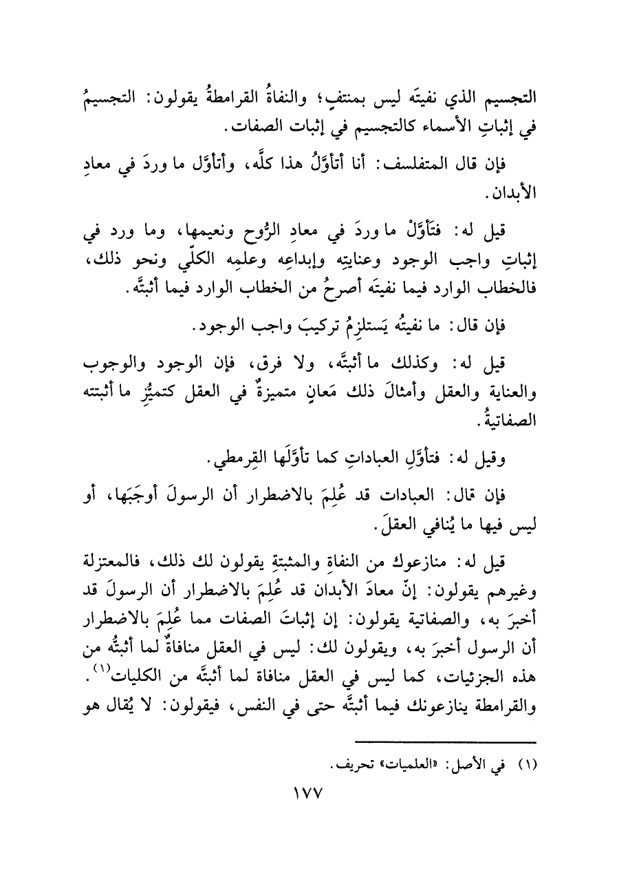 التجسيم الذي نفيتَه ليس بمنتفٍ، والنفاةُ القرامطةُ يقولون: التجسيمُ في إثباتِ الأسماء كالتجسيم في إثبات الصفات.
