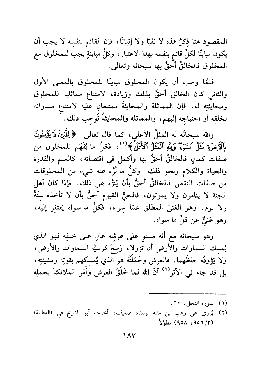 المقصود هنا ذِكرُ هذه لا نفيًا ولا إثباتًا، فإن القائم بنفسِه لا يجب أن يكون مباينًا لكل قائم بنفسه بهذا الاعتبار، وكل مباينةٍ يجب للمخلوق مع المخلوق فالخالقُ أحقُ بها سبحانه وتعالى.