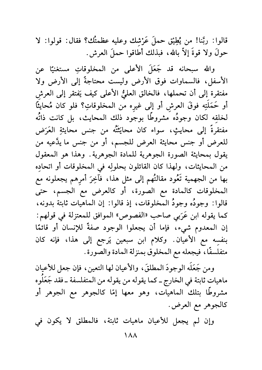 والله سبحانه قد جَعَلَ الأعلى من المخلوقاتِ مستغنيًا عن الأسفل، فالسماوات فوق الأرض وليست محتاجةً إلى الأرض ولا مفتقرة إلى أن تحملها، فالخالق العليُّ الأعلى كيف يَفتقر إلى العرشِ أو حَمَلَتِه فوقَ العرشِ أو إلى غيرِه من المخلوقاتِ؟ فلو كان مُحايثًا لخلقِه لكان وجودُه مشروطًا بوجود ذلك المحايث، بل كانت ذاتُه مفتقرةً إلى محايثٍ، سواء كان محايَثته من جنس محايثةِ العَرَض للعرض أو جنس محايثة العرض للجسم، أو من جنس ما يدَّعيه من يقول بمحايثة الصورة الجوهرية للمادة الجوهرية. وهذا هو المعقول من المحايثات، ولهذا كان القائلون بحلوله في المخلوقات أو اتحادِه بها من الجهمية تَعُود مقالتُهم إلى مثل هذا، فآخِرَ أمرِهم يجعلونه مع المخلوقات كالمادة مع الصورة، أو كالعرض مع الجسم، حتى قالوا: وجودُه وجودُ المخلوقات، إذ قالوا: إن الماهيات ثابتة بدونه، كما يقوله ابن عَرَبي صاحب "الفصوص" الموافق للمعتزلة في قولهم: إن المعدوم شيء، فإما أن يجعلوا الوجود صفةً للإنسان أو قائمًا بنفسِه مع الأعيان. وكلام ابن سبعين يَرجع إلى هذا، فإنه كان متفلسفًا، فيجعله مع المخلوق بمنزلة المادة والصورة.