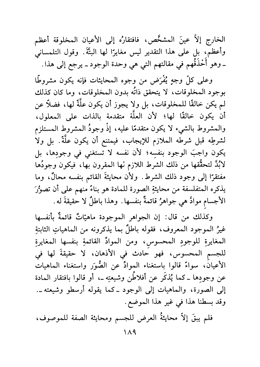 وعلى كلّ وجهٍ يُفْرَض من وجوه المحايثات فإنه يكون مشروطًا بوجود المخلوقات، لا يتحقق ذاتُه بدون المخلوقات، وما كان كذلك لم يكن خالقًا للمخلوقات، بل ولا يجوز أن يكون علَّةً لها، فضلًا عن أن يكون خالقًا لها؛ لأن العلَّة متقدمة بالذات على المعلول، والمشروط بالشيء لا يكون متقدمًا عليه، إذْ وجودُ المشروط المستلزم لشرطِه قبل شرطه الملازم للإيجاب، فيمتنع أن يكون علَّة. بل ولا يكون واجبَ الوجود بنفسِه، لأن نفسه لا تستغني في وجودِها، بل لابُدَّ لتحقُّقها من ذلك الشرط اللازم لها المقرون بها، فيكون وجودُها مفتقرًا إلى وجود ذلك الشرط. ولأن محايثةَ القائم بنفسه محالٌ، وما يذكره المتفلسفة من محايثةِ الصورة للمادة هو بناءً منهم على أن تصوُّرَ الأجسامِ موادَّ هي جواهرُ قائمةٌ بنفسها. وهذا باطلٌ لا حقيقةَ له.