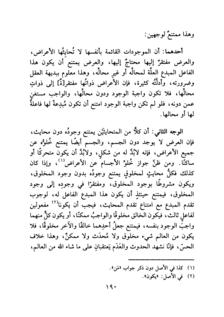 الوجه الثاني: أن كلاًّ من المتحايثَين يمتنع وجودُه دون محايث، فإن العرض لا يوجد دون الجسم، والجسم أيضًا يمتنع خُلوُّه عن جميع الأعراض، فانه لابُدَّ له من شكلٍ، والأبدانُ تكون متحركًا أو ساكنًا. ومن ظنَّ جواز خُلوِّ الأجسام عن الأعراض (¬١)، وإذا كان كذلك فكلُّ محايثٍ لمخلوقٍ يمتنع وجودُه بدون وجود المخلوق، ويكون مشروطًا بوجود المخلوق، ومفتقرًا في وجودِه إلى وجود المخلوق، فيمتنع حينئذٍ أن يكون هذا المبدع الفاعل له، لوجوب تقدم المبدع مع امتناع تقدم المحايث، فيجب أن يكونا (¬٢) مفعولين لفاعلٍ ثالث، فيكون الخالق مخلوقًا والواجبُ ممكنًا، أو يكون كلٌّ منهما واجبَ الوجود بنفسه، فيمتنع جعلُ أحدِهما خالقًا والآخر مخلوقًا، فلا يكون من العالم شيء مخلوق ولا مُحدَث ولا ممكنٌ، وهذا خلاف الحسّ، فإنّا نشهد الحدوث والعَدَم يَعتقبانِ على ما شاء الله من