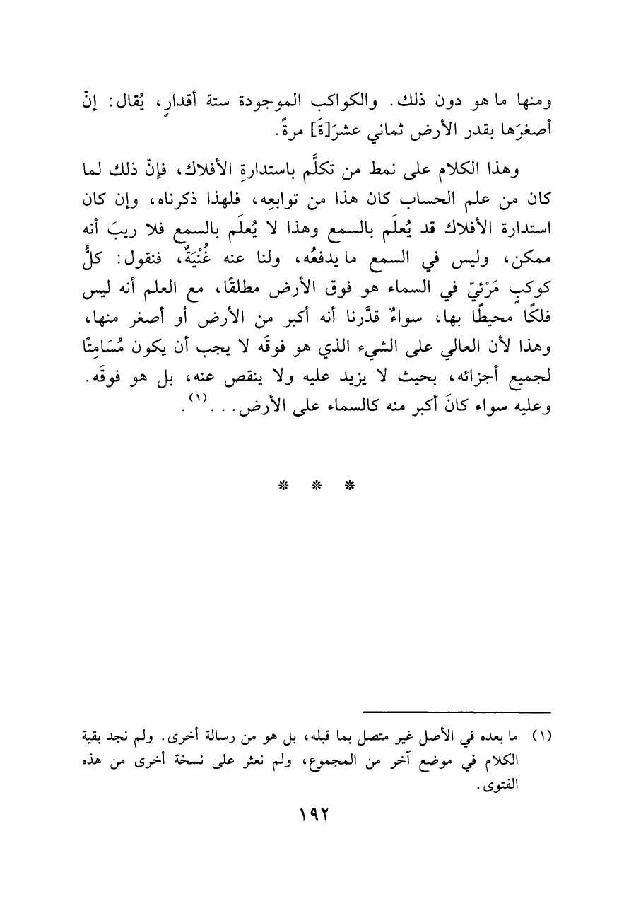 ومنها ما هو دون ذلك. والكواكب الموجودة ستة أقدارٍ، يُقال: إنّ أصغرَها بقدر الأرض ثماني عشرَ [ةَ] مرة.