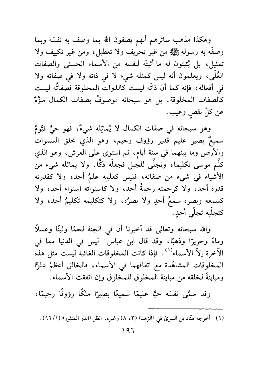 وهكذا مذهب سائرهم أنهم يصفون الله بما وصف به نفسَه وبما وصفَه به رسوله - صَلَّى اللَّهُ عَلَيْهِ وَسَلَّمَ - من غير تحريف ولا تعطيل، ومن غير تكييف ولا تمثيل، بل يُثبتون له ما أثبتَه لنفسه من الأسماء الحسنى والصفات العُلَي، ويعلمون أنه ليس كمثله شيء لا في ذاته ولا في صفاته ولا في أفعاله، فإنه كما أن ذاتَه ليست كالذوات المخلوقة فصفاتُه ليست كالصفات المخلوقة. بل هو سبحانه موصوفٌ بصفات الكمال منزَّهٌ عن كلّ نقصٍ وعيب.