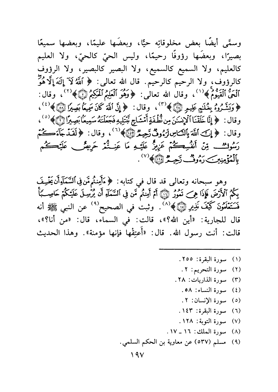 وسمَّى أيضًا بعض مخلوقاتِه حيًّا، وبعضَها عليمًا، وبعضها سميعًا بصيرًا، وبعضَها رءوفًا رحيمًا، وليس الحي كالحيّ، ولا العليم كالعليم، ولا السميع كالسميع، ولا البصير كالبصير، ولا الرءوف كالرءوف، ولا الرحيم كالرحيم. قال الله تعالى (اللَّهُ لا إِلَهَ إِلَّا هُوَ الْحَيُّ الْقَيُّومُ) (¬١)، وقال الله تعالى: (وَهُوَ العَلِيمُ الحَكِيمُ (٢)) (¬٢)، وقال: (وَبَشَّرُوهُ بِغُلامٍ عَلِيمٍ (٢٨)) (¬٣)، وقال: (إِنَّ اللَّهَ كَانَ سَمِيعًا بَصِيرًا (٥٨)) (¬٤)، وقال: (إِنَّا خَلَقْنَا الْأِنْسَانَ مِنْ نُطْفَةٍ أَمْشَاجٍ نَبْتَلِيهِ فَجَعَلْنَاهُ سَمِيعًا بَصِيرًا (٢)) (¬٥)، وقال: (إِنَّ اللَّهَ بِالنَّاسِ لَرَؤُوفٌ رَحِيمٌ (١٤٣)) (¬٦)، وقال: (لَقَدْ جَاءَكُمْ رَسُولٌ مِنْ أَنْفُسِكُمْ عَزِيزٌ عَلَيْهِ مَا عَنِتُّمْ حَرِيصٌ عَلَيْكُمْ بِالْمُؤْمِنِينَ رَؤُوفٌ رَحِيمٌ (١٢٨)) (¬٧).