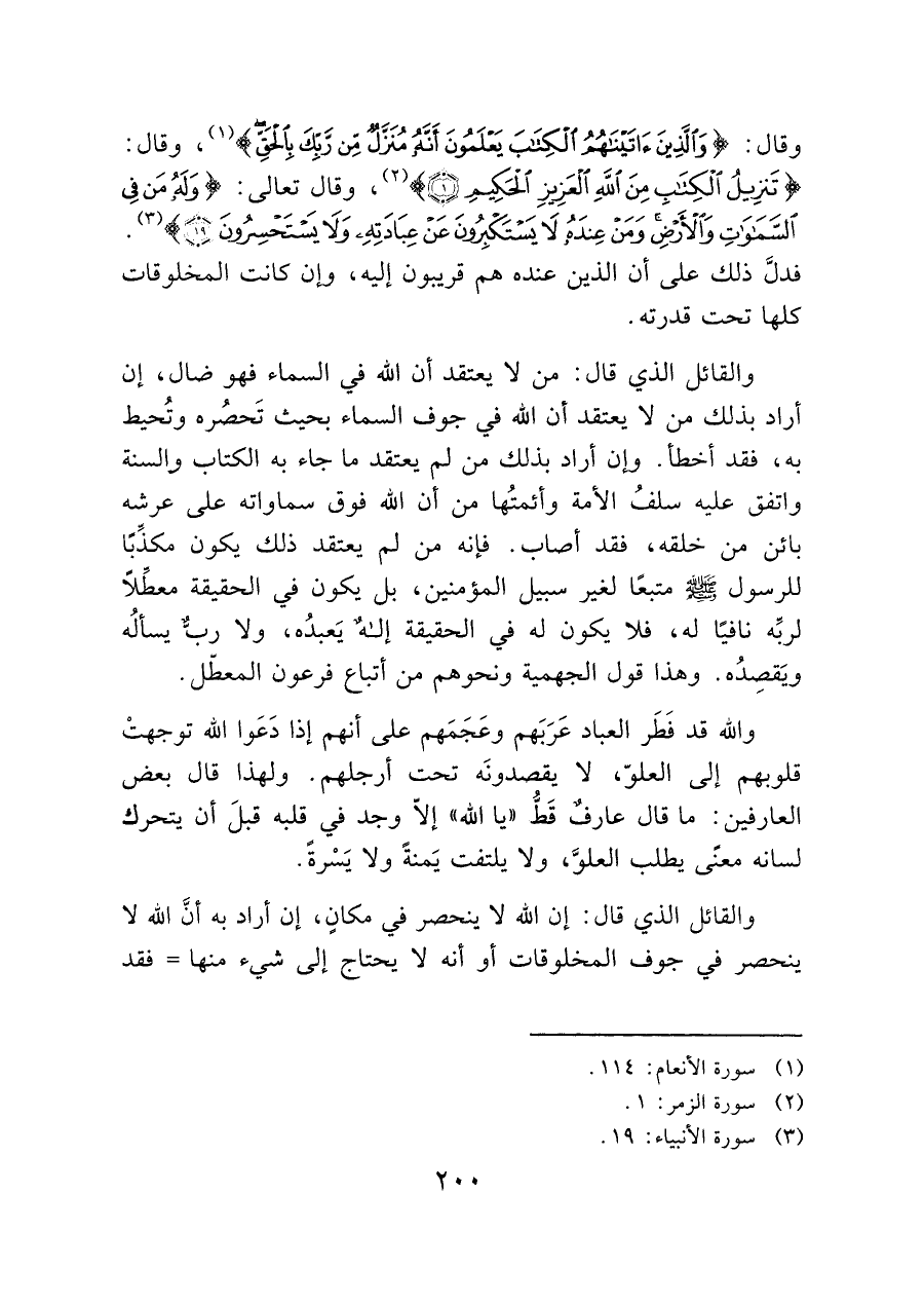 والقائل الذي قال: من لا يعتقد أن الله في السماء فهو ضال، إن أراد بذلك من لا يعتقد أن الله في جوف السماء بحيث تَحصُره وتُحيط به، فقد أخطأ. وإن أراد بذلك من لم يعتقد ما جاء به الكتاب والسنة واتفق عليه سلفُ الأمة وأئمتُها من أن الله فوق سماواته على عرشه بائن من خلقه، فقد أصاب. فإنه من لم يعتقد ذلك يكون مكذبًا للرسول - صَلَّى اللَّهُ عَلَيْهِ وَسَلَّمَ - متبعًا لغير سبيل المؤمنين، بل يكون في الحقيقة معطِّلًا لربِّه نافيًا له، فلا يكون له في الحقيقة إلهٌ يَعبدُه، ولا ربّ يسألُه ويَقصِدُه. وهذا قول الجهمية ونحوهم من أتباع فرعون المعطل.