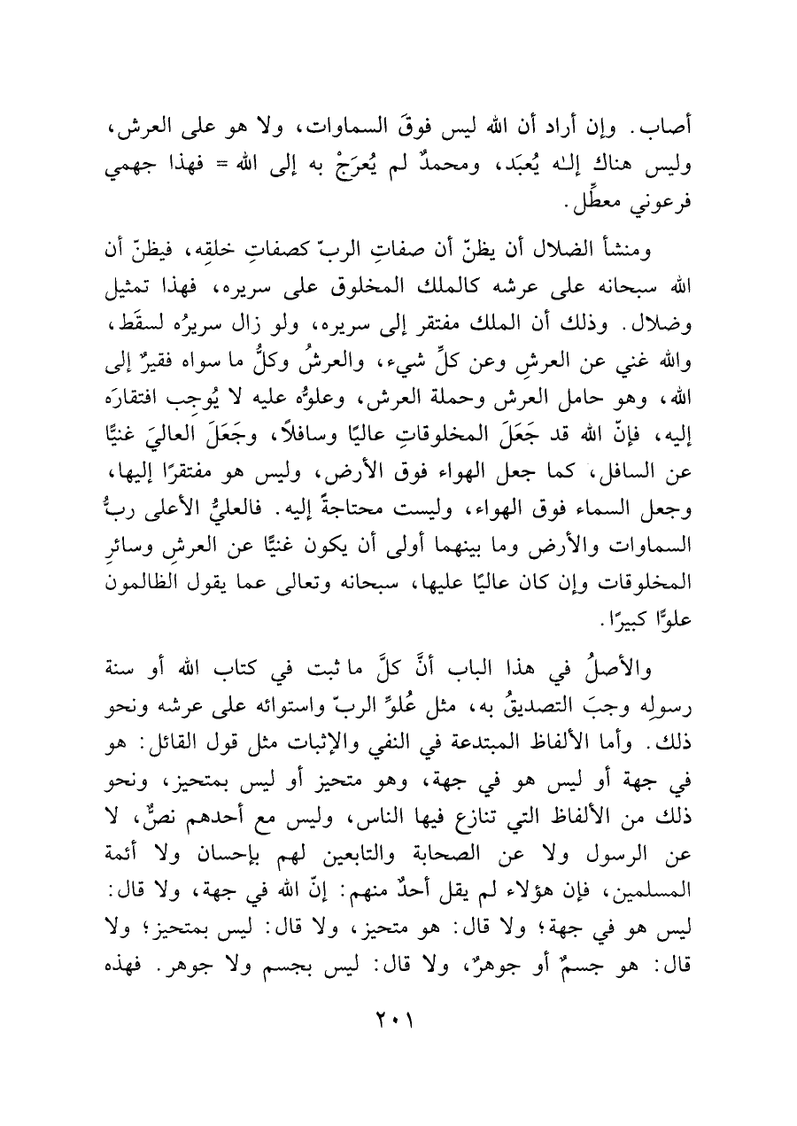 والأصلُ في هذا الباب أنَّ كل ما ثبت في كتاب الله أو سنة رسوله وجبَ التصديقُ به، مثل عُلوِّ الربّ واستوائه على عرشه ونحو ذلك. وأما الألفاظ المبتدعة في النفي والإثبات مثل قول القائل: هو في جهة أو ليس هو في جهة، وهو متحيز أو ليس بمتحيز، ونحو ذلك من الألفاظ التي تنازع فيها الناس، وليس مع أحدهم نصٌّ، لا عن الرسول ولا عن الصحابة والتابعين لهم بإحسان ولا أئمة المسلمين، فإن هؤلاء لم يقل أحدٌ منهم: إنّ الله في جهة، ولا قال: ليس هو في جهة؟ ولا قال: هو متحيز، ولا قال: ليس بمتحيز؟ ولا قال: هو جسم أو جوهرٌ، ولا قال: ليس بجسم ولا جوهر. فهذه