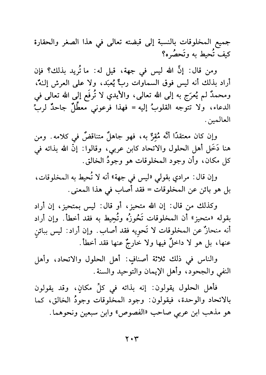 وإن كان معتقدًا أنَّه مُقِرٌّ به، فهو جاهل متناقضٌ في كلامه. ومن هنا دَخَل أهل الحلول والاتحاد كابن عربي، وقالوا: إنّ الله بذاته في كل مكان، وأن وجود المخلوقات هو وجودُ الخالق.