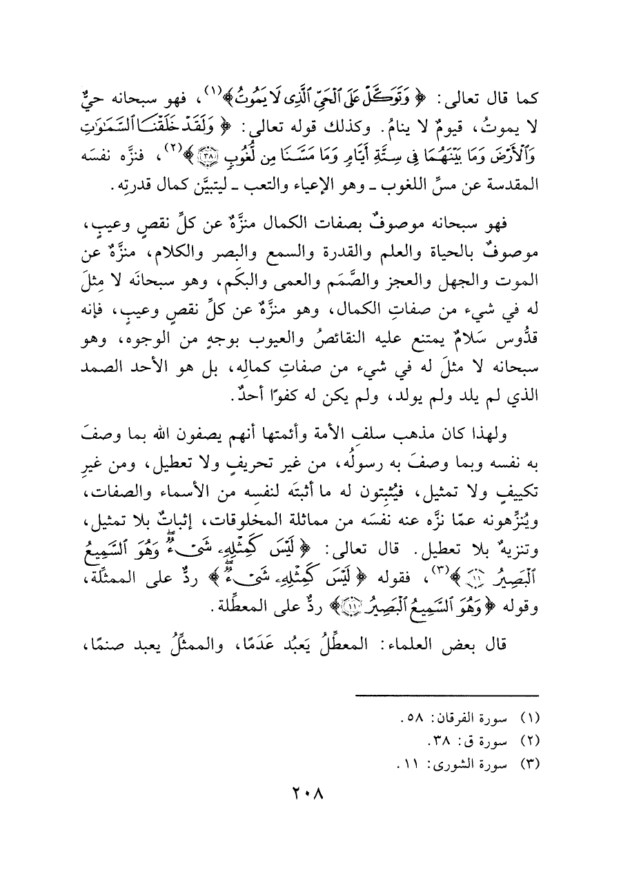 ولهذا كان مذهب سلفِ الأمة وأئمتها أنهم يصفون الله بما وصفَ به نفسه وبما وصفَ به رسولُه، من غير تحريفٍ ولا تعطيل، ومن غيرِ تكييفٍ ولا تمثيل، فيُثبِتون له ما أثبتَه لنفسِه من الأسماء والصفات، ويُنزِّهونه عمَّا نزَّه عنه نفسَه من مماثلة المخلوقات، إثباتٌ بلا تمثيل، وتنزيهٌ بلا تعطيل. قال تعالى (لَيْسَ كَمِثْلِهِ شَيْءٌ وَهُوَ السَّمِيعُ الْبَصِيرُ (١١)) (¬٣)، فقوله (لَيْسَ كَمِثْلِهِ شَيْءٌ) رد على الممثِّلة، وقوله: (وَهُوَ السَّمِيعُ الْبَصِيرُ (١١)) رد على المعطِّلة.