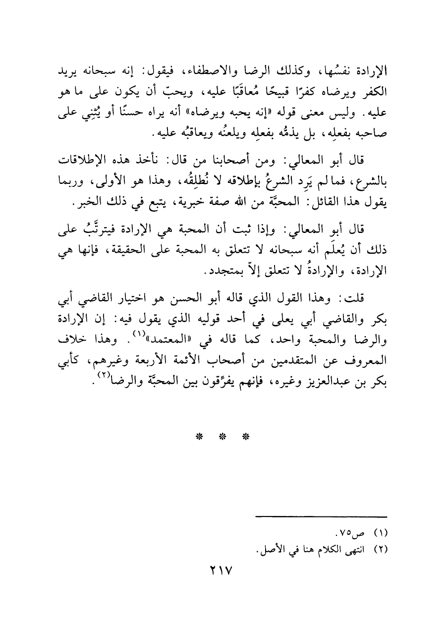 الإرادة نفسُها، وكذلك الرضا والاصطفاء، فيقول: إنه سبحانه يريد الكفر ويرضاه كفرًا قبيحًا مُعاقَبًا عليه، ويحبّ أن يكون على ما هو عليه. وليس معنى قوله "إنه يحبه ويرضاه" أنه يراه حسنًا أو يُثنِي على صاحبه بفعلِه، بل يذمُّه بفعلِه ويلعنُه ويعاقبُه عليه.