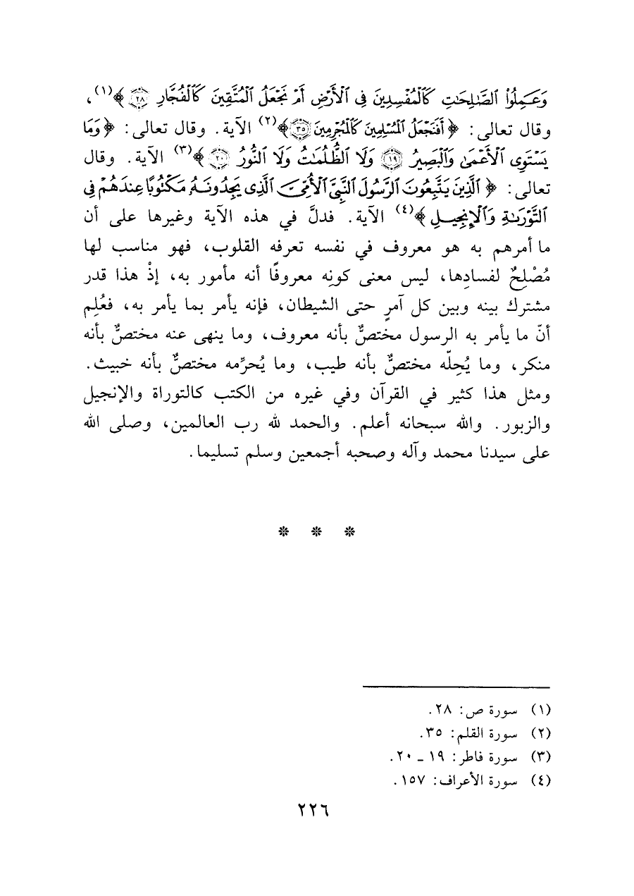 وَعَمِلُوا الصَّالِحَاتِ كَالْمُفْسِدِينَ فِي الْأَرْضِ أَمْ نَجْعَلُ الْمُتَّقِينَ كَالْفُجَّارِ (٢٨)) (¬١)، وقال تعالى: (أَفَنَجْعَلُ الْمُسْلِمِينَ كَالْمُجْرِمِينَ (٣٥)) (¬٢) الآية. وقال تعالى: (وَمَا يَسْتَوِي الْأَعْمَى وَالْبَصِيرُ (١٩) وَلا الظُّلُمَاتُ وَلا النُّورُ (٢٠)) (¬٣) الآية. وقال تعالى: (الَّذِينَ يَتَّبِعُونَ الرَّسُولَ النَّبِيَّ الْأُمِّيَّ الَّذِي يَجِدُونَهُ مَكْتُوبًا عِنْدَهُمْ فِي التَّوْرَاةِ وَالْأِنْجِيلِ) (¬٤) الآية. فدلَّ في هذه الآية وغيرها على أن ما أمرهم به هو معروف في نفسه تعرفه القلوب، فهو مناسب لها مُصْلِحٌ لفسادِها، ليس معنى كونه معروفًا أنه مأمور به، إذْ هذا قدر مشترك بينه وبين كل آمرٍ حتى الشيطان، فإنه يأمر بما يأمر به، فعُلِم أنّ ما يأمر به الرسول مختصٌّ بأنه معروف، وما ينهى عنه مختصٌ بأنه منكر، وما يُحِلّه مختصٌّ بأنه طيب، وما يُحزَمه مختصٌّ بأنه خبيث. ومثل هذا كثير في القرآن وفي غيره من الكتب كالتوراة والإنجيل والزبور. والله سبحانه أعلم. والحمد لله رب العالمين، وصلى الله على سيدنا محمد وآله وصحبه أجمعين وسلم تسليما.