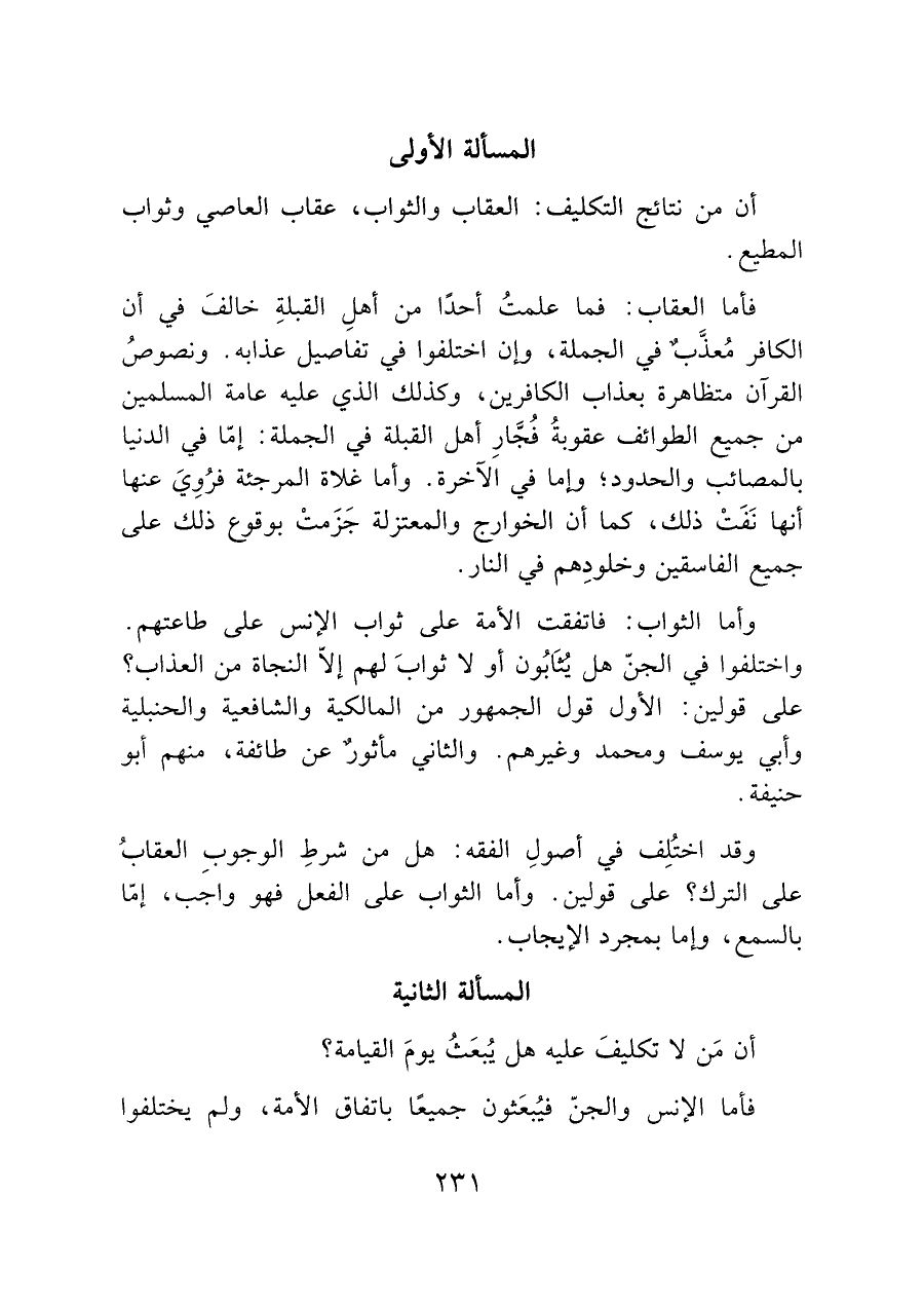 وقد اختُلِف في أصولِ الفقه: هل من شرطِ الوجوب العقابُ على الترك؟ على قولين. وأما الثواب على الفعل فهو واجب، إمّا بالسمع، وإما بمجرد الإيجاب.