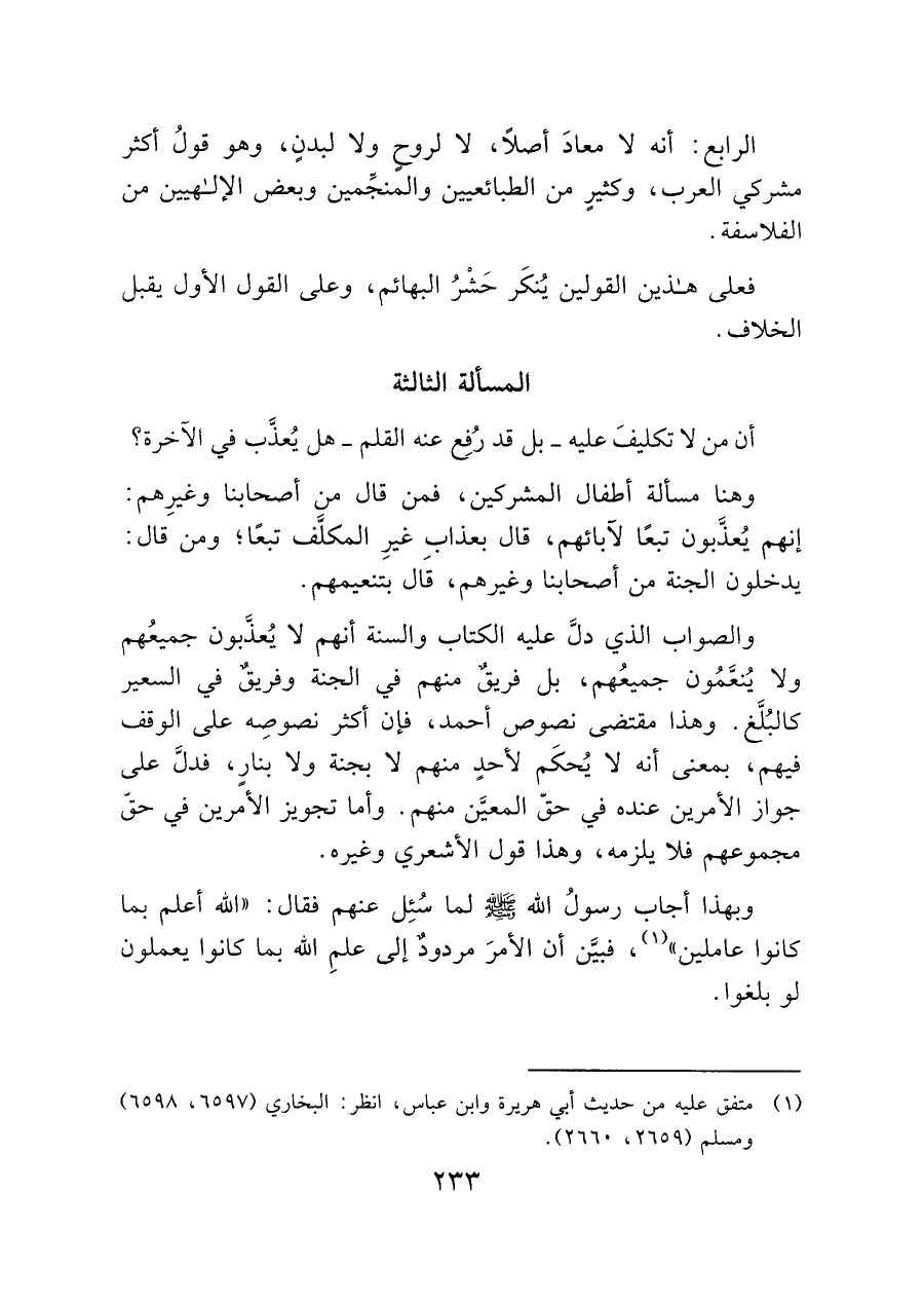 والصواب الذي دل عليه الكتاب والسنة أنهم لا يُعذَّبون جميعُهم ولا يُنعَّمُون جميعُهم، بل فريق منهم في الجنة وفريقٌ في السعير كالبُلَّغ. وهذا مقتضى نصوص أحمد، فإن أكثر نصوصِه على الوقف فيهم، بمعنى أنه لا يُحكَم لأحدٍ منهم لا بجنة ولا بنارٍ، فدلَّ على جواز الأمرين عنده في حقّ المعيَّن منهم. وأما تجويز الأمرين في حقّ مجموعهم فلا يلزمه، وهذا قول الأشعري وغيره.