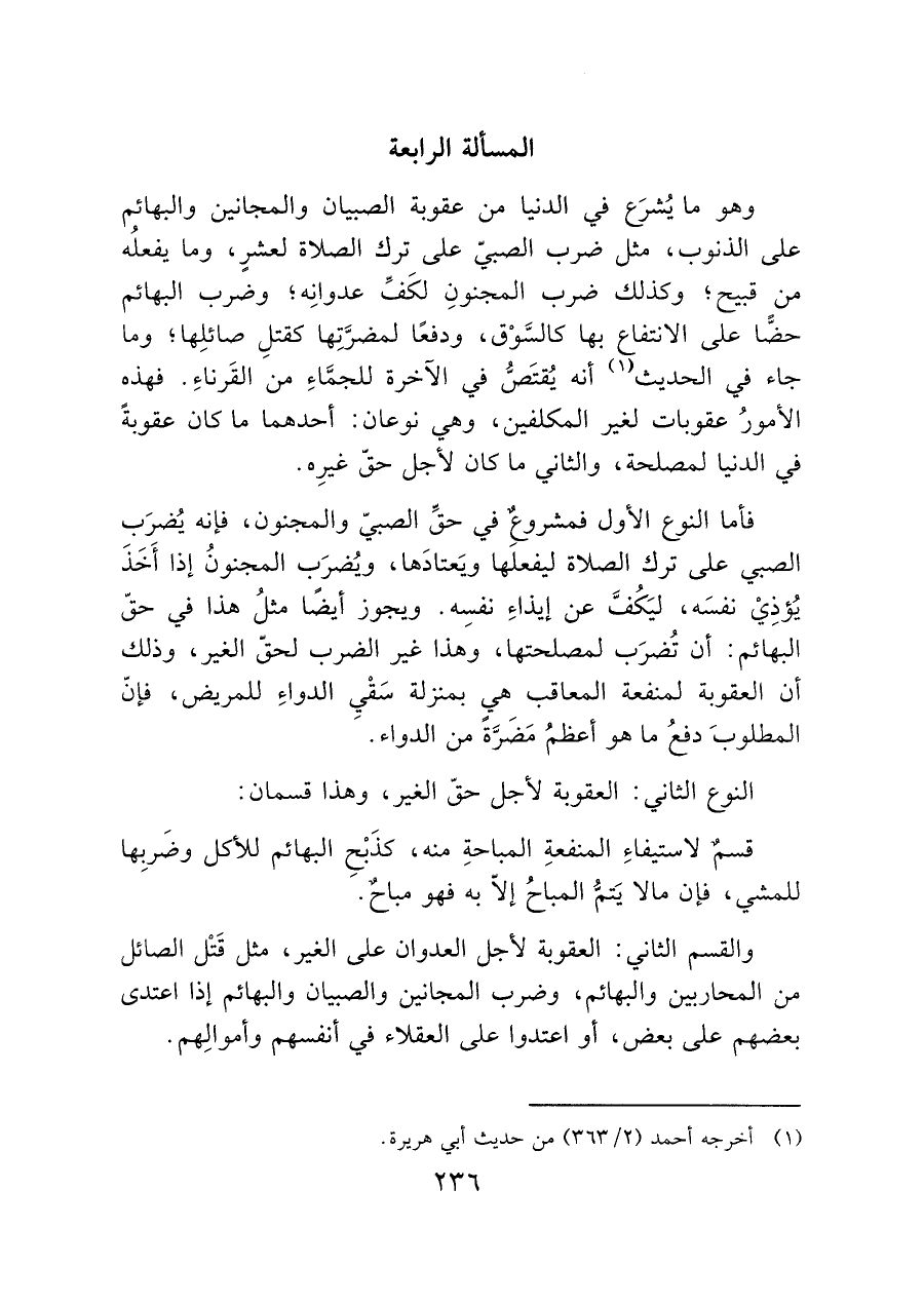 وهو ما يُشرَع في الدنيا من عقوبة الصبيان والمجانين والبهائم على الذنوب، مثل ضرب الصبي على ترك الصلاة لعشرٍ، وما يفعلُه من قبيح؛ وكذلك ضرب المجنونِ لكَفِّ عدوانِه؛ وضرب البهائم حضا على الانتفاع بها كالسَّوْق، ودفعًا لمضرَّتها كقتلِ صائلِها، وما جاء في الحديث (¬١) أنه يُقتَصُّ في الآخرة للجمَّاءِ من القَرناءِ. فهذه الأمورُ عقوبات لغير المكلفين، وهي نوعان: أحدهما ما كان عقوبةً في الدنيا لمصلحة، والثاني ما كان لأجل حق غيرِه.