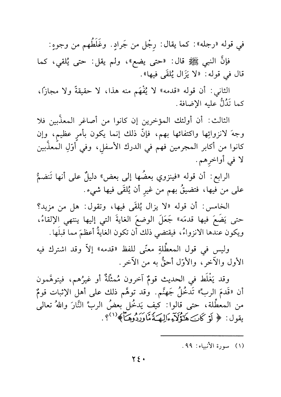 وقد يَغْلَط في الحديث قومٌ آخرون مُمثِّلةٌ أو غيرُهم، فيتوهَّمون أن "قَدمَ الربِّ" تَدخُلُ جَهنَّم. وقد توهَّم ذلك على أهل الإثبات قومٌ من المعطِّلة، حتى قالوا: كيف يَدخُل بعضُ الربِّ النَّارَ واللهُ تعالى يقول: (لَوْ كَانَ هَؤُلاءِ آلِهَةً مَا وَرَدُوهَا) (¬١)؟.