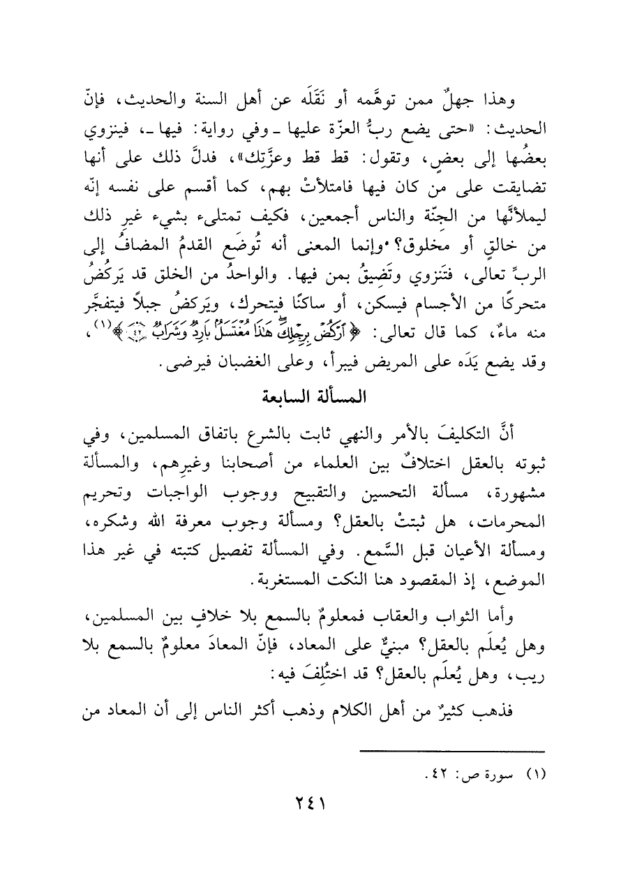 وهذا جهل ممن توهَّمه أو نَقَلَه عن أهل السنة والحديث، فإنّ الحديث: "حتى يضع ربُّ العزّة عليها -وفي رواية: فيها-، فينزوي بعضُها إلى بعضٍ، وتقول: قط قط وعزَّتِك"، فدلَّ ذلك على أنها تضايقت على من كان فيها فامتلأتْ بهم، كما أقسم على نفسه إنّه ليملأنَّها من الجثة والناس أجمعين، فكيف تمتلئ بشيء غيرِ ذلك من خالقٍ أو مَخلوق؟. وإنما المعنى أنه تُوضَع القدمُ المضافُ إلى الربِّ تعالى، فتَنزوي وتَضِيقُ بمن فيها. والواحدُ من الخلق قد يَركُضُ متحركًا من الأجسام فيسكن، أو ساكنًا فيتحرك، ويَركضُ جبلًا فيتفجَّر منه ماءٌ، كما قال تعالى: (ارْكُضْ بِرِجْلِكَ هَذَا مُغْتَسَلٌ بَارِدٌ وَشَرَابٌ (٤٢)) (¬١)، وقد يضع يَدَه على المريض فيبرأ، وعلى الغضبان فيرضى.