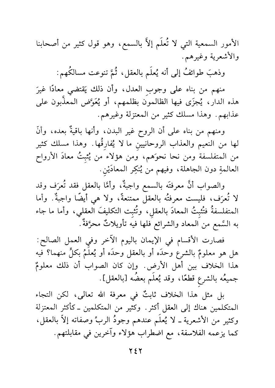 والصواب أنَّ معرفتَه بالسمع واجبةٌ، وأمَّا بالعقل فقد تُعرَف وقد لا تُعرَف، فليست معرفتُه بالعقل ممتنعةً، ولا هي أيضًا واجبةٌ. وأما المتفلسفةُ فتُثبتُ المعادَ بالعقلِ، وتُثبِت التكليفَ العقلي، وأما ما جاء به السَّمع من المعاد والشرائع فلها فيه تأويلاتٌ محرَّفةٌ.