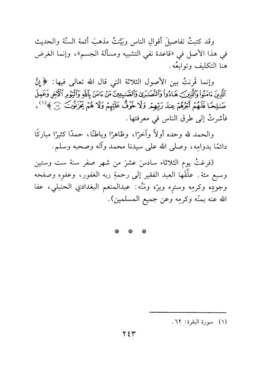 وإنما قَرنتُ بين الأصول الثلاثة التي قال الله تعالى فيها: (إِنَّ الَّذِينَ آمَنُوا وَالَّذِينَ هَادُوا وَالنَّصَارَى وَالصَّابِئِينَ مَنْ آمَنَ بِاللَّهِ وَالْيَوْمِ الْآخِرِ وَعَمِلَ صَالِحًا فَلَهُمْ أَجْرُهُمْ عِنْدَ رَبِّهِمْ وَلا خَوْفٌ عَلَيْهِمْ وَلا هُمْ يَحْزَنُونَ (٦٢)) (¬١)، فأشرتُ إلى طرق الناس في معرفتها.