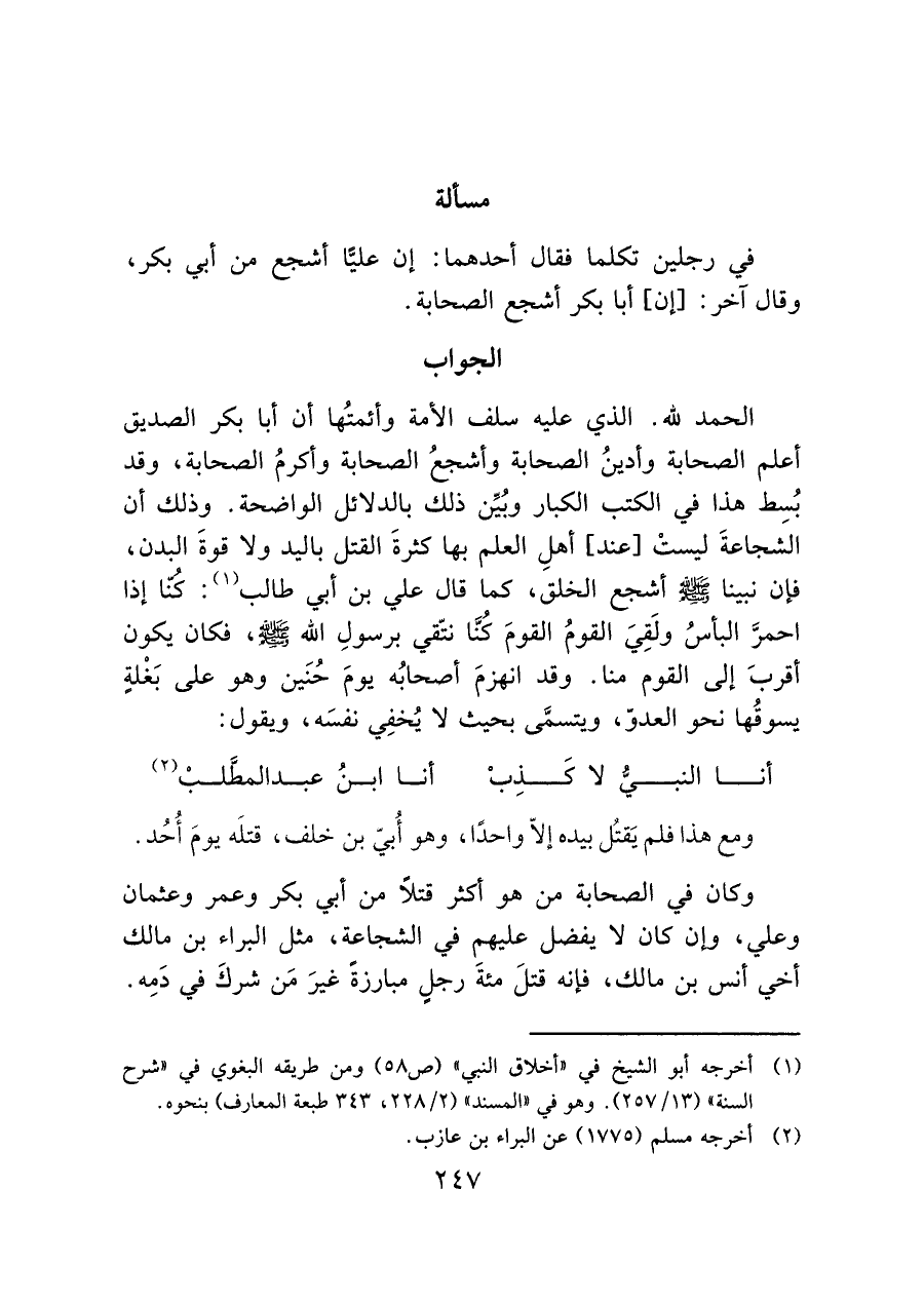 الحمد لله. الذي عليه سلف الأمة وأئمتُها أن أبا بكر الصديق أعلم الصحابة وأدينُ الصحابة وأشجعُ الصحابة وأكرمُ الصحابة، وقد بُسِط هذا في الكتب الكبار وبُيِّن ذلك بالدلائل الواضحة. وذلك أن الشجاعةَ ليستْ [عند] أهلِ العلم بها كثرةَ القتل باليد ولا قوةَ البدن، فإن نبينا - صَلَّى اللَّهُ عَلَيْهِ وَسَلَّمَ - أشجع الخلق، كما قال علي بن أبي طالب (¬١): كُنّا إذا احمرَّ البأسُ ولَقِيَ القومُ القومَ كُنَّا نتّقي برسولِ الله - صَلَّى اللَّهُ عَلَيْهِ وَسَلَّمَ -، فكان يكون أقربَ إلى القوم منا. وقد انهزمَ أصحابُه يومَ حُنَين وهو على بَغْلِه يسوقُها نحو العدوّ، ويتسمَّى بحيث لا يُخفِي نفسَه، ويقول: