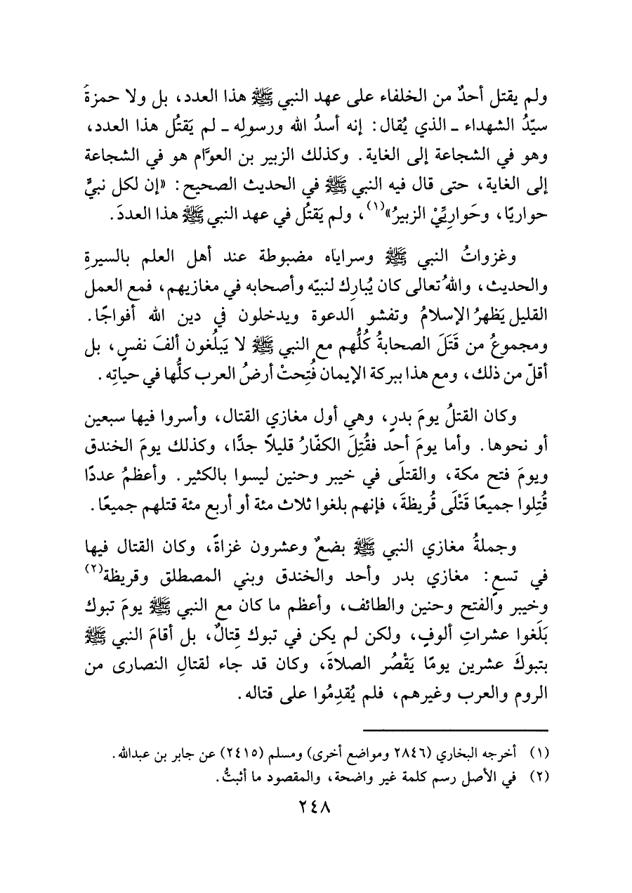وغزواتُ النبي - صَلَّى اللَّهُ عَلَيْهِ وَسَلَّمَ - وسراياه مضبوطة عند أهل العلم بالسيرةِ والحديث، والله تعالى كان يُبارِك لنبيّه وأصحابه في مغازيهم، فمع العمل القليل يَظهرُ الإسلام وتفشو الدعوة ويدخلون في دين الله أفواجًا. ومجموعُ من قَتَلَ الصحابةُ كلُّهم مع النبي - صَلَّى اللَّهُ عَلَيْهِ وَسَلَّمَ - لا يَبلُغون ألفَ نفسٍ، بل أقلّ من ذلك، ومع هذا ببركة الإيمان فُتِحتْ أرضُ العرب كلُّها في حياتِه.