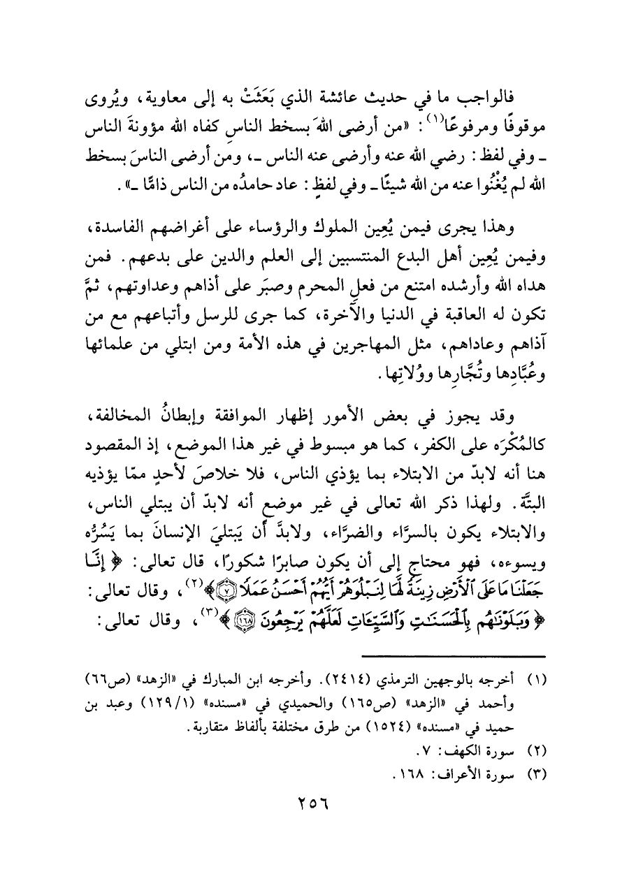 وقد يجوز في بعض الأمور إظهار الموافقة وإبطانُ المخالفة، كالمُكْرَه على الكفر، كما هو مبسوط في غير هذا الموضع، إذ المقصود هنا أنه لابدّ من الابتلاء بما يؤذي الناس، فلا خلاصَ لأحدٍ ممّا يؤذيه البتَّة. ولهذا ذكر الله تعالى في غير موضع أنه لابدّ أن يبتلي الناس، والابتلاء يكون بالسرَّاء والضرَّاء، ولابدَّ أن يَبتليَ الإنسانَ بما يَسُرُّه ويسوؤه، فهو محتاج إلى أن يكون صابرًا شكورًا، قال تعالى: (إِنَّا جَعَلْنَا مَا عَلَى الْأَرْضِ زِينَةً لَهَا لِنَبْلُوَهُمْ أَيُّهُمْ أَحْسَنُ عَمَلًا (٧)) (¬٢)، وقال تعالى: (وَبَلَوْنَاهُمْ بِالْحَسَنَاتِ وَالسَّيِّئاتِ لَعَلَّهُمْ يَرْجِعُونَ (١٦٨)) (¬٣)، وقال تعالى:
