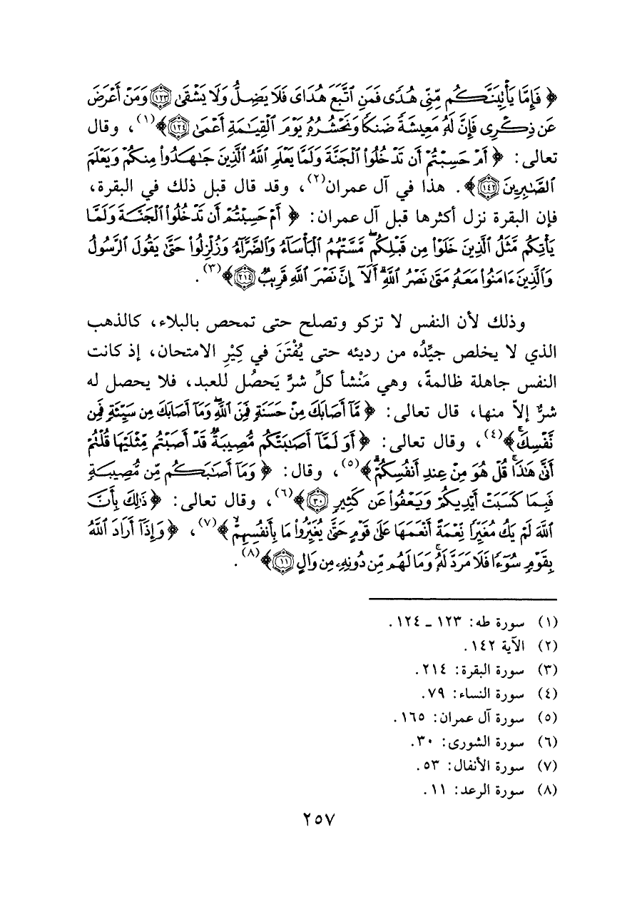 (فَإِمَّا يَأْتِيَنَّكُمْ مِنِّي هُدىً فَمَنِ اتَّبَعَ هُدَايَ فَلا يَضِلُّ وَلا يَشْقَى (١٢٣) وَمَنْ أَعْرَضَ عَنْ ذِكْرِي فَإِنَّ لَهُ مَعِيشَةً ضَنْكًا وَنَحْشُرُهُ يَوْمَ الْقِيَامَةِ أَعْمَى (١٢٤)) (¬١)، وقال تعالى: (أَمْ حَسِبْتُمْ أَنْ تَدْخُلُوا الْجَنَّةَ وَلَمَّا يَعْلَمِ اللَّهُ الَّذِينَ جَاهَدُوا مِنْكُمْ وَيَعْلَمَ الصَّابِرِينَ (١٤٢)). هذا في آل عمران (¬٢)، وقد قال قبل ذلك في البقرة، فإن البقرة نزل أكثرها قبل آل عمران: (أَمْ حَسِبْتُمْ أَنْ تَدْخُلُوا الْجَنَّةَ وَلَمَّا يَأْتِكُمْ مَثَلُ الَّذِينَ خَلَوْا مِنْ قَبْلِكُمْ مَسَّتْهُمُ الْبَأْسَاءُ وَالضَّرَّاءُ وَزُلْزِلُوا حَتَّى يَقُولَ الرَّسُولُ وَالَّذِينَ آمَنُوا مَعَهُ مَتَى نَصْرُ اللَّهِ أَلا إِنَّ نَصْرَ اللَّهِ قَرِيبٌ (٢١٤)) (¬٣).