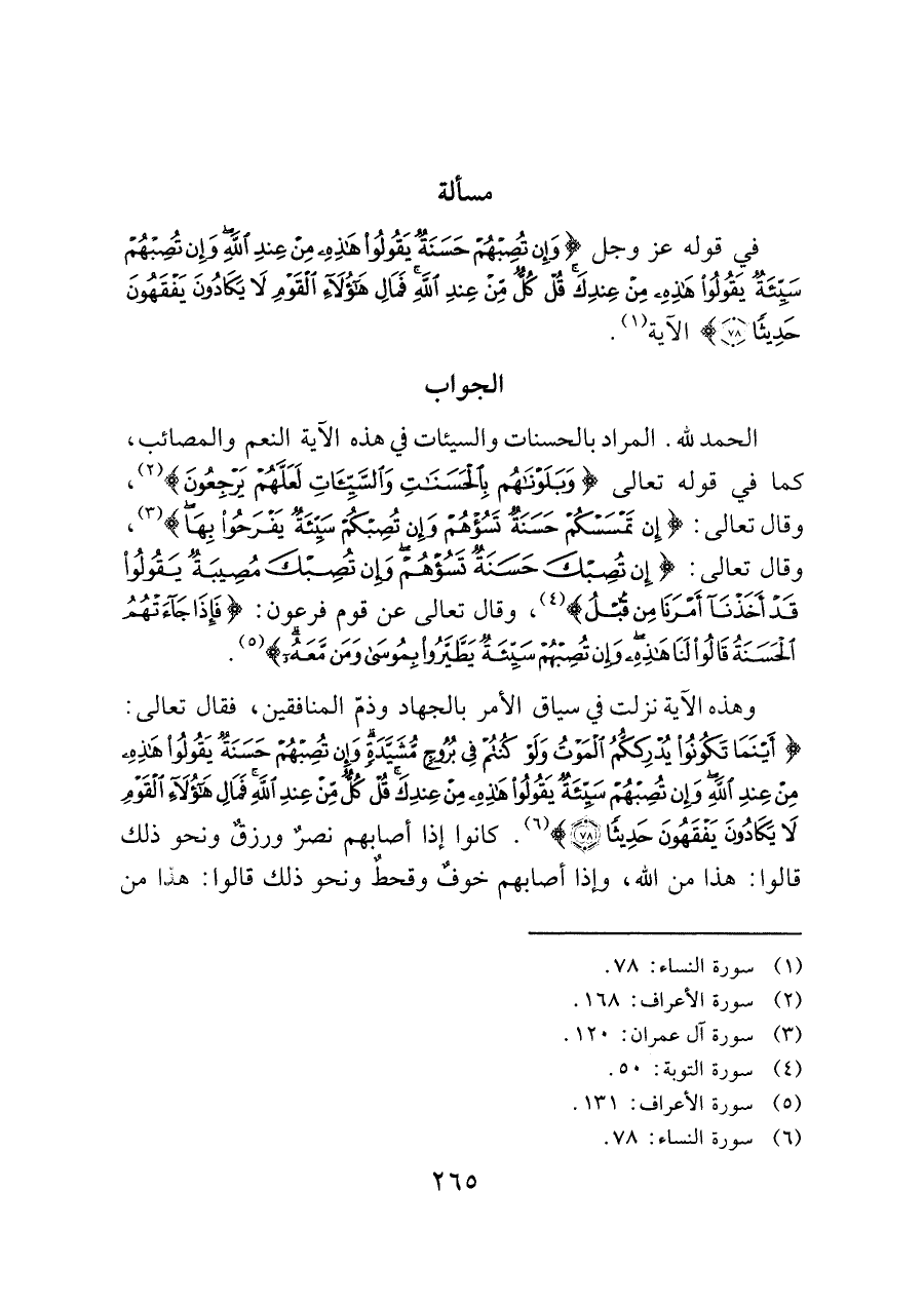 في قوله عز وجل (وَإِنْ تُصِبْهُمْ حَسَنَةٌ يَقُولُوا هَذِهِ مِنْ عِنْدِ اللَّهِ وَإِنْ تُصِبْهُمْ سَيِّئَةٌ يَقُولُوا هَذِهِ مِنْ عِنْدِكَ قُل كُلٌّ مِنْ عِنْدِ اللَّهِ فَمَالِ هَؤُلاءِ الْقَوْمِ لا يَكَادُونَ يَفْقَهُونَ حَدِيثًا (٧٨)) الآية (¬١).