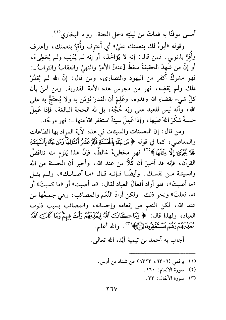 ومن قال: إن الحسنات والسيئات في هذه الآية المراد بها الطاعات والمعاصي، كما في قوله (مَنْ جَاءَ بِالْحَسَنَةِ فَلَهُ عَشْرُ أَمْثَالِهَا وَمَنْ جَاءَ بِالسَّيِّئَةِ فَلا يُجْزَى إِلَّا مِثْلَهَا) (¬٢) فهو مخطئٌ غالط، فإنّ هذا يَلزم منه تناقضُ القرآن، فإنه قد أخبرَ أن كُلاًّ من عند الله، وأخبر أن الحسنة من الله والسيئة من نفسك. وأيضًا فإنه قال "ما أصابك"، ولم يقل "ما أصبتَ"، فلو أراد أفعالَ العباد لقال: "ما أصبت" أو "ما كسبتَ" أو "ما فعلتَ" ونحو ذلك. ولكن أرادَ النِّعَم والمصائب، وهي جميعُها من عند الله، لكن النعم من إنعامه وإحسانه، والمصائب بسبب ذنوب العباد، ولهذا قال: (وَمَا كَانَ اللَّهُ لِيُعَذِّبَهُمْ وَأَنْتَ فِيهِمْ وَمَا كَانَ اللَّهُ مُعَذِّبَهُمْ وَهُمْ يَسْتَغْفِرُونَ (٣٣)) (¬٣). والله أعلم. أجاب به أحمد بن تيمية أيَّده الله تعالى.