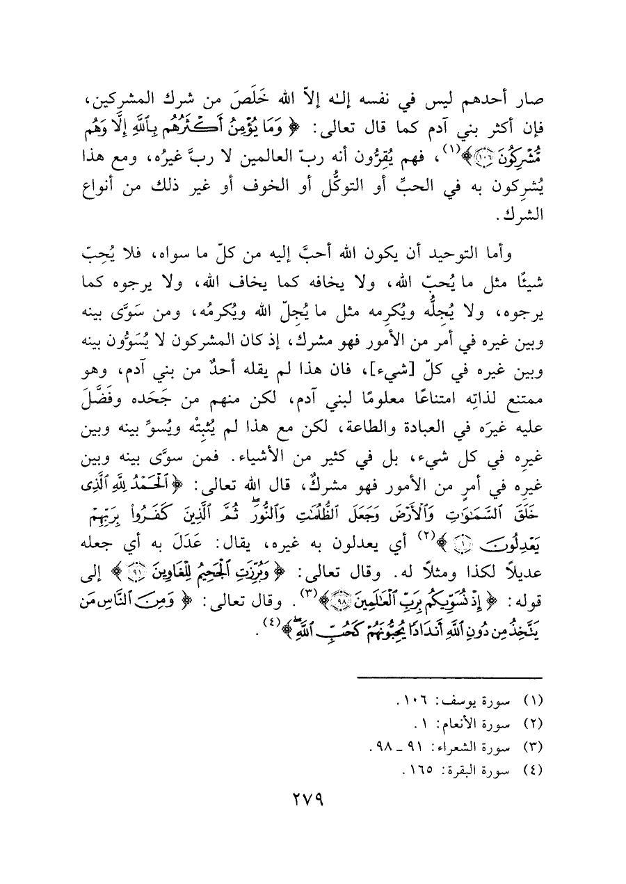 وأما التوحيد أن يكون الله أحبَّ إليه من كلّ ما سواه، فلا يُحِبّ شيئًا مثل ما يُحبّ الله، ولا يخافه كما يخاف الله، ولا يرجوه كما يرجوه، ولا يُجلُّه ويُكرِمه مثل ما يُجلّ الله ويُكرمُه، ومن سَوَى بينه وبين غيره في أمَر من الأمور فهو مشركَ، إذ كان المشركون لا يُسَوُّون بينه وبين غيره في كل [شيء]، فان هذا لم يقله أحدٌ من بني آدم، وهو ممتنع لذاتِه امتناعًا معلومًا لبني آدم، لكن منهم من جَحَده وفَضَّلَ عليه غيرَه في العبادة والطاعة، لكن مع هذا لم يثبِتْه ويُسوِّ بينه وبين غيرِه في كل شيء، بل في كثير من الأشياء. فمن سوَّى بينه وبين غيرِه في أمرٍ من الأمور فهو مشركٌ، قال الله تعالى (الْحَمْدُ لِلَّهِ الَّذِي خَلَقَ السَّمَاوَاتِ وَالْأَرْضَ وَجَعَلَ الظُّلُمَاتِ وَالنُّورَ ثُمَّ الَّذِينَ كَفَرُوا بِرَبِّهِمْ يَعْدِلُونَ (١)) (¬٢) أي يعدلون به غيره، يقال: عَدَلَ به أي جعله عديلًا لكذا ومثلًا له. وقال تعالى: (وَبُرِّزَتِ الْجَحِيمُ لِلْغَاوِينَ (٩١)) إلى قوله: (إِذْ نُسَوِّيكُمْ بِرَبِّ الْعَالَمِينَ (٩٨)) (¬٣) وقال تعالى: (وَمِنَ النَّاسِ مَنْ يَتَّخِذُ مِنْ دُونِ اللَّهِ أَنْدَادًا يُحِبُّونَهُمْ كَحُبِّ اللَّهِ) (¬٤).