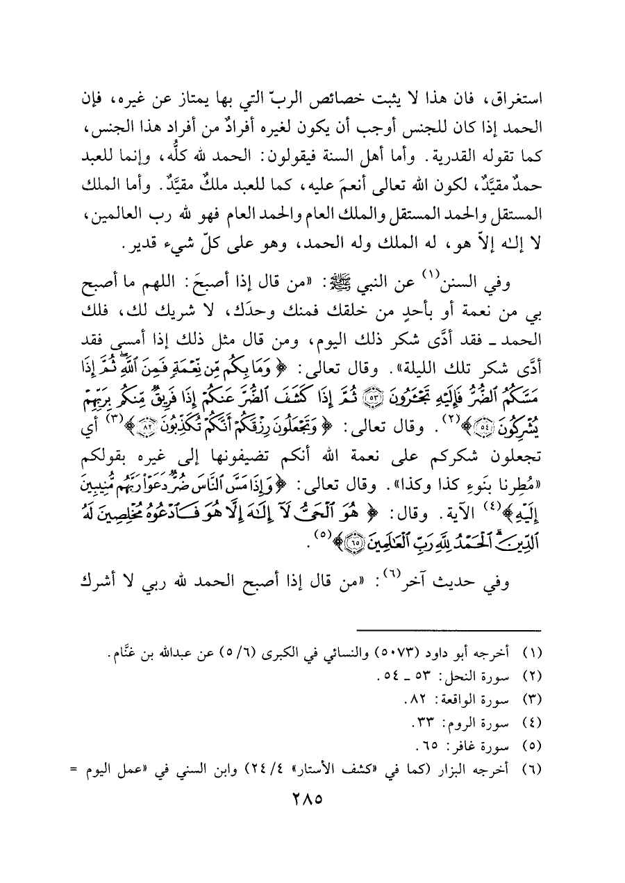 وفي السنن (¬١) عن النبي - صَلَّى اللَّهُ عَلَيْهِ وَسَلَّمَ -: "من قال إذا أصبحَ: اللهم ما أصبح بي من نعمة أو بأحدٍ من خلقك فمنك وحدَك، لا شريك لك، فلك الحمد -فقد أدَّى شكر ذلك اليوم، ومن قال مثل ذلك إذا أمسى فقد أدَّى شكر تلك الليلة". وقال تعالى: (وَمَا بِكُمْ مِنْ نِعْمَةٍ فَمِنَ اللَّهِ ثُمَّ إِذَا مَسَّكُمُ الضُّرُّ فَإِلَيْهِ تَجْأَرُونَ (٥٣) ثُمَّ إِذَا كَشَفَ الضُّرَّ عَنْكُمْ إِذَا فَرِيقٌ مِنْكُمْ بِرَبِّهِمْ يُشْرِكُونَ (٥٤) (¬٢). وقال تعالى: (وَتَجْعَلُونَ رِزْقَكُمْ أَنَّكُمْ تُكَذِّبُونَ (٨٢)) (¬٣) أي تجعلون شكركم على نعمة الله أنكم تضيفونها إلى غيره بقولكمِ "مُطِرنا بنَوءِ كذا وكذا". وقال تعالى: (وَإِذَا مَسَّ النَّاسَ ضُرٌّ دَعَوْا رَبَّهُمْ مُنِيبِينَ إِلَيْهِ) (¬٤) الآية. وقال: (هُوَ الْحَيُّ لا إِلَهَ إِلَّا هُوَ فَادْعُوهُ مُخْلِصِينَ لَهُ الدِّينَ الْحَمْدُ لِلَّهِ رَبِّ الْعَالَمِينَ (٦٥)) (¬٥).