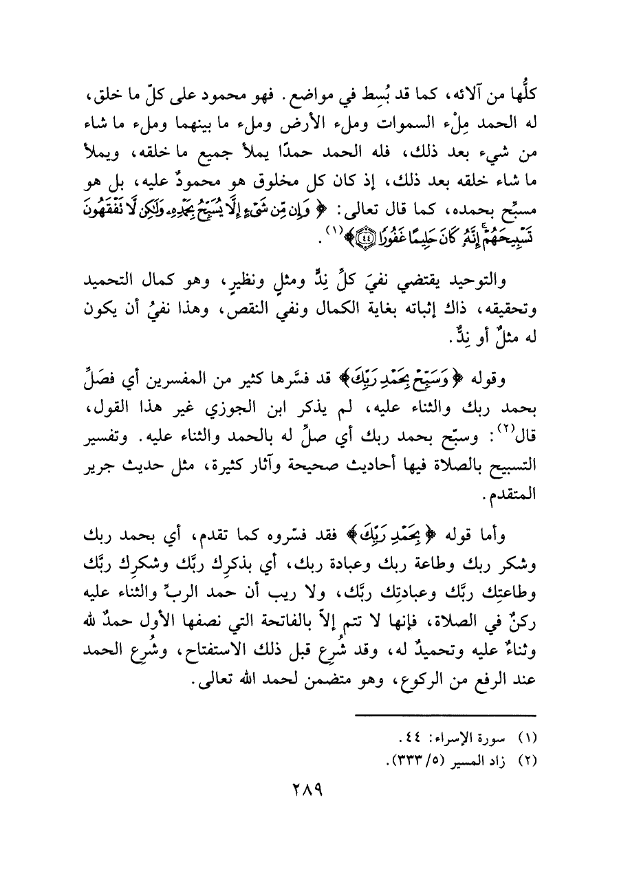 وأما قوله (بِحَمْدِ رَبِّكَ) فقد فسّروه كما تقدم، أي بحمد ربك وشكر ربك وطاعة ربك وعبادة ربك، أي بذكرِك ربَّك وشكرِك ربَّك وطاعتِك ربَّك وعبادتِك ربَّك، ولا ريب أن حمد الربِّ والثناء عليه ركن في الصلاة، فإنها لا تتم إلا بالفاتحة التي نصفها الأول حمدٌ لله وثناءٌ عليه وتحميدٌ له، وقد شُرِع قبل ذلك الاستفتاح، وشُرِع الحمد عند الرفع من الركوع، وهو متضمن لحمد الله تعالى.