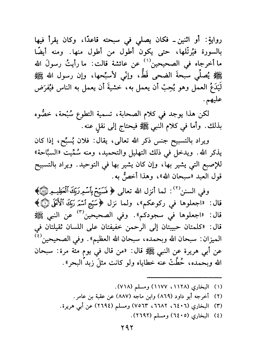 لكن هذا يوجد في كلام الفصحاء، تسمية التطوع سُبْحة، خصُّوه بذلك. وأما في كلام النبي - صَلَّى اللَّهُ عَلَيْهِ وَسَلَّمَ - فيحتاج إلى نقل عنه.